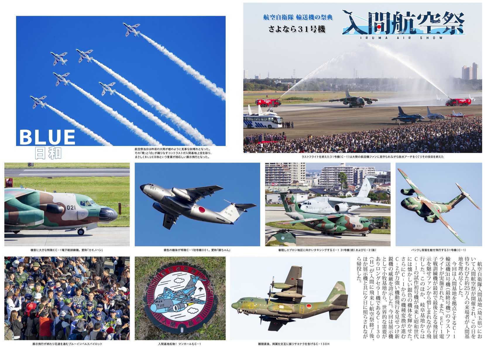 今回は、入間基地を拠点とするC–1輸送機31号機(最終号機)のラストフライトが実施された。また、EC−1電子戦訓練機が最初で最後となる飛行展示を魅せファンから惜しまれながら飛行した。このほか、岐阜基地からはC−1の試作初号機が飛来し昭和世代には懐かしい銀色の機体を輝かせた。さらにC−1からの機種変換が進むC−2が力強い機動飛行を見せつけ新鋭機の威厳を誇示した。今回は展示機として小牧基地から、世界的な需要がありロングセラー機であるC−130(H)が入間に飛来し航空祭終了後、ほか展示機と共に夕日に照らされながら帰投した。