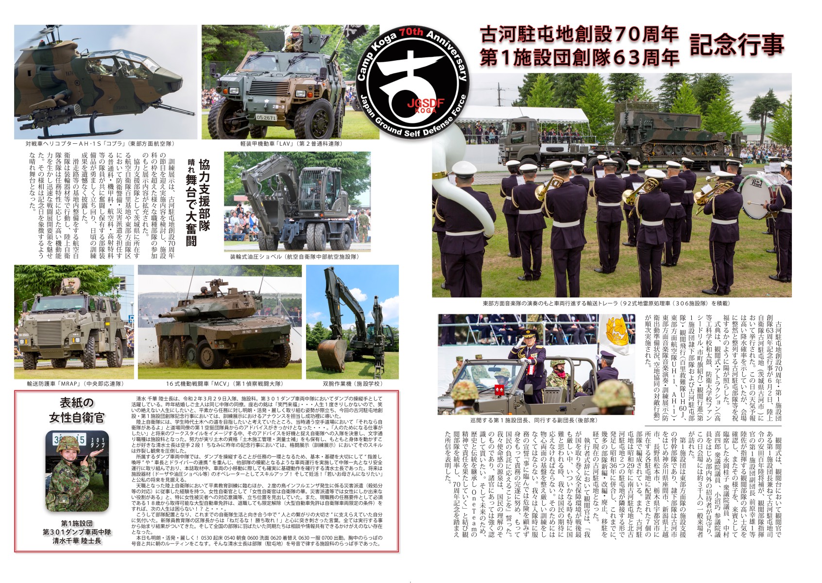 古河駐屯地創設70周年 第1施設団創隊63周年 記念行事 2024/07/11 古河駐屯地創設70周年・第1施設団創隊63周年記念行事が6月2日、陸上自衛隊古河駐屯地(茨城県古河市)において挙行された。