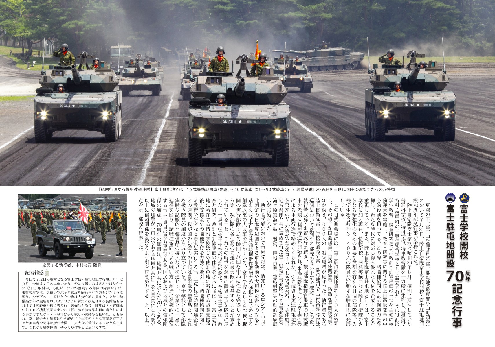 富士学校開校・富士駐屯地開設70周年記念行事 2024/08/22 夏空の下、富士山を仰ぎ見る富士駐屯地(駿東郡小山町須走)において7月21日、陸上自衛隊富士学校開校・富士駐屯地開設70周年記念行事が挙行された。