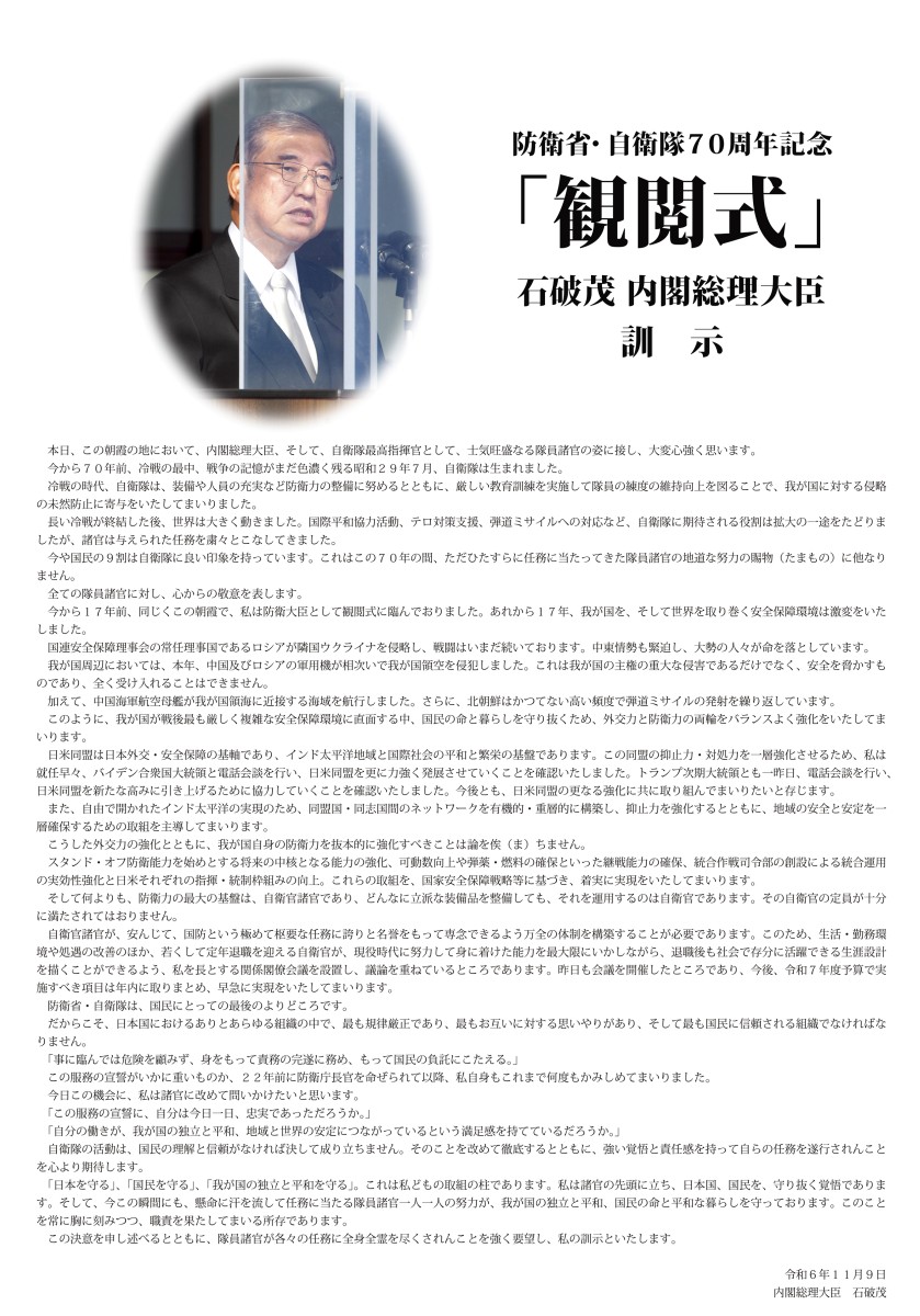 防衛省・自衛隊 70周年記念「観閲式」石破茂 内閣総理大臣訓示