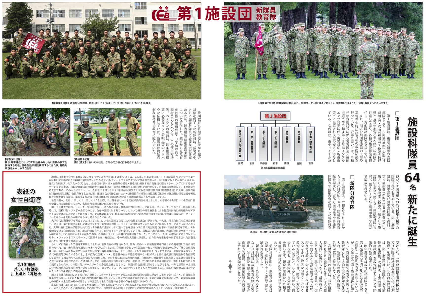 第1施設団は、東部方面隊の直轄部隊として、古河(茨城県)・座間(神奈川県)・高田(新潟県)・松本(長野県)及び宇都宮(栃木県)に部隊が駐屯しており、各種の施設作業を担任し、方面隊諸部隊を支援している。