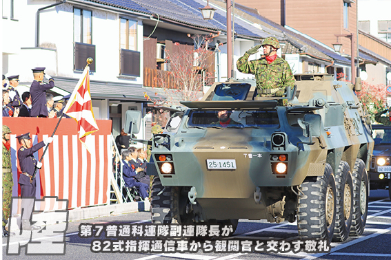 11月29日、京都府福知山市中心部において、「陸上自衛隊福知山駐屯地創立75周年記念行事 市中パレード」が開催された。本パレードは昭和25年の警察予備隊発足時に、仙台から第504施設大隊が移駐してきた際の記念パレードに端を発する。その後も毎年パレードが行われてきたが一時途絶えた時期があった後、市民有志の要望により平成5年に復活した。復活後も、災害派遣や新型コロナウイルスの影響で中止となった年を除き毎年開催されており、歴史と伝統のあるパレードである。ただし令和6年は開催できず、令和7年は2年ぶりの開催となった。