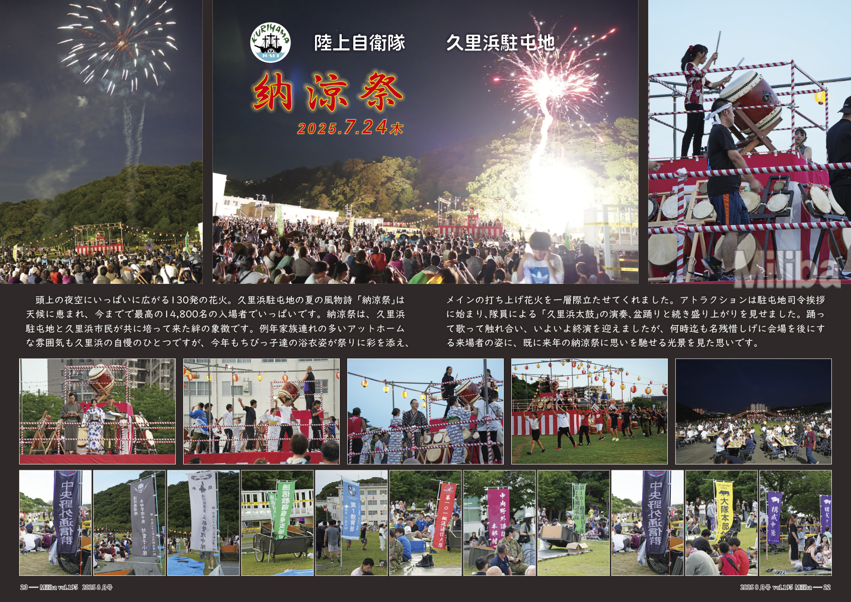 頭上の夜空にいっぱいに広がる130発の花火。久里浜駐屯地の夏の風物詩「納涼祭」は天候に恵まれ、今までで最高の14,800名の入場者でいっぱいです。納涼祭は、久里浜駐屯地と久里浜市民が共に培って来た絆の象徴です。例年家族連れの多いアットホームな雰囲気も久里浜の自慢のひとつですが、今年もちびっ子達の浴衣姿が祭りに彩を添え、メインの打ち上げ花火を一層際立たせてくれました。アトラクションは駐屯地司令挨拶に始まり、隊員による「久里浜太鼓」の演奏、盆踊りと続き盛り上がりを見せました。踊って歌って触れ合い、いよいよ終演を迎えましたが、何時迄も名残惜しげに会場を後にする来場者の姿に、既に来年の納涼祭に思いを馳せる光景を見た思いです。