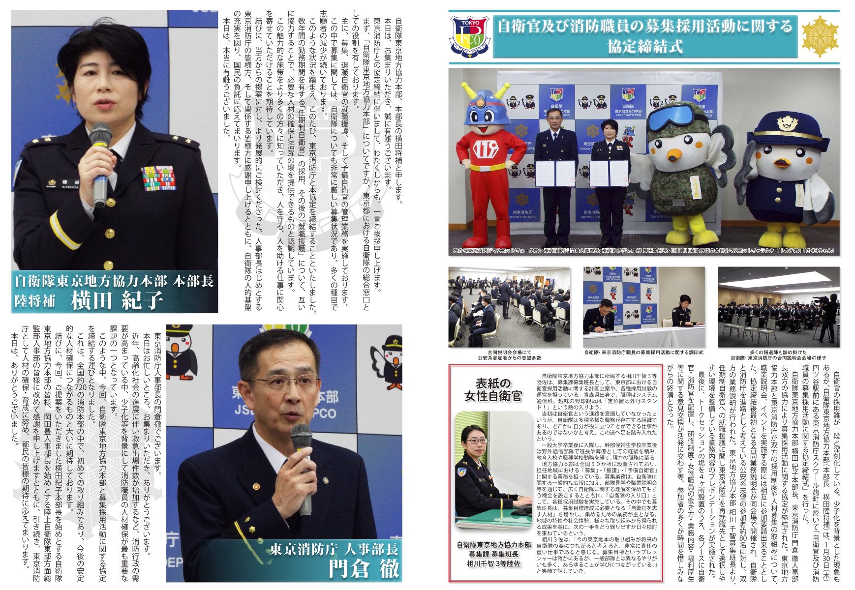 自衛官及び消防職員の募集採用活動に関する協定締結式 2025/03/13 自衛官及び消防職員の募集採用活動に関する協定締結式 自衛官の採用難が一段と深刻化している。少子化を背景とした現象もあるが、自衛隊東京地方協力本部(本部長 横田陸将補)は、1月30日(木)四ツ谷駅前にある東京消防庁スクワール麹町に於いて「自衛官及び消防職員の募集採用活動に関する協定締結式」を行った。