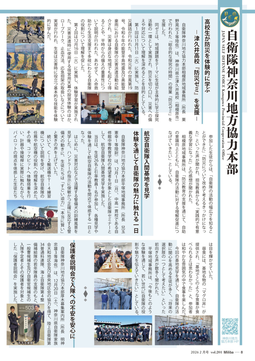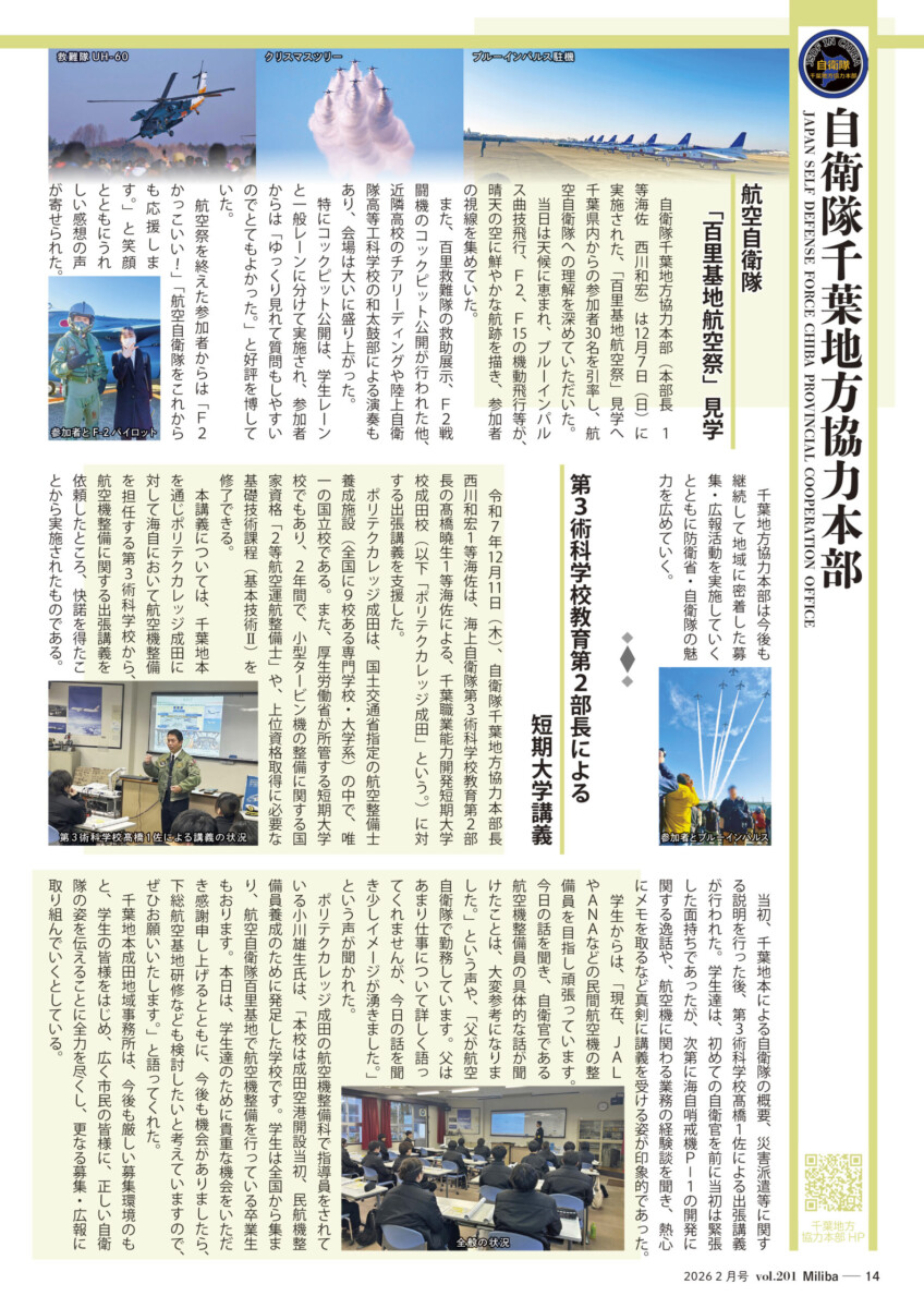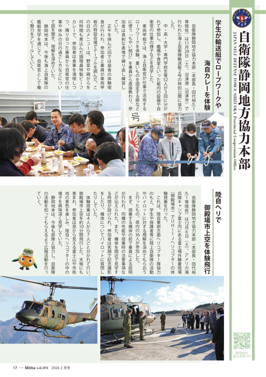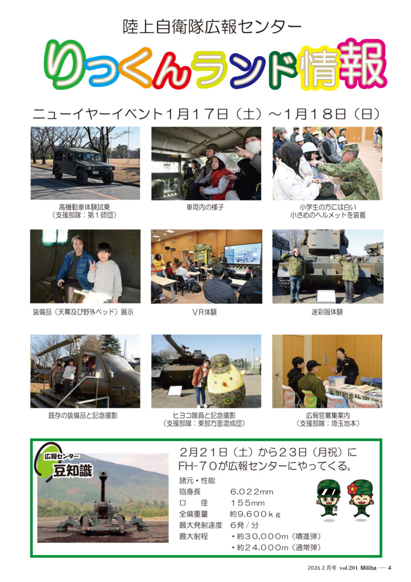 Vol.201(2026年 2月号) 2026/02/10 2026年2月号(令和8年2月号) 自衛隊情報誌Miliba2月号を公開しました❣ 陸上自衛隊広報センター「りっくんランド」はじめ全国各地の自衛隊地方協力本部などにて設置・配布中です。