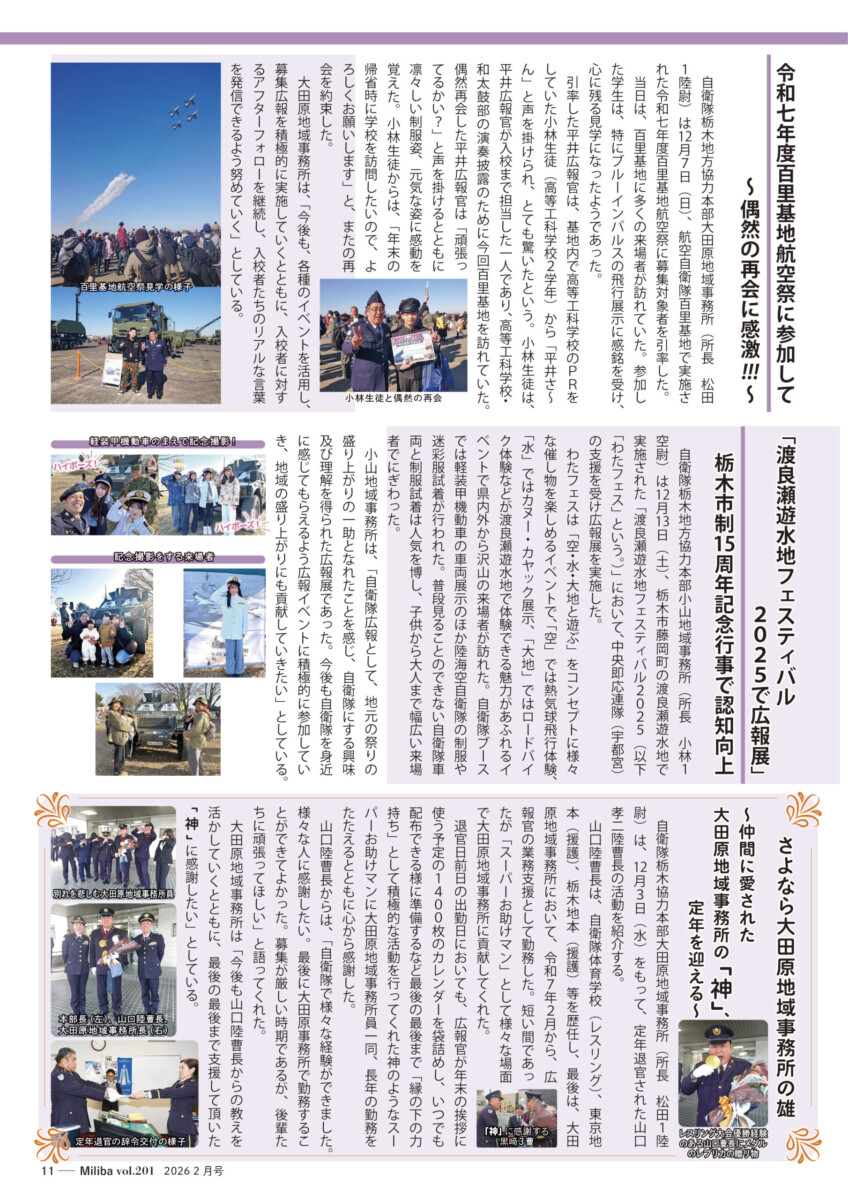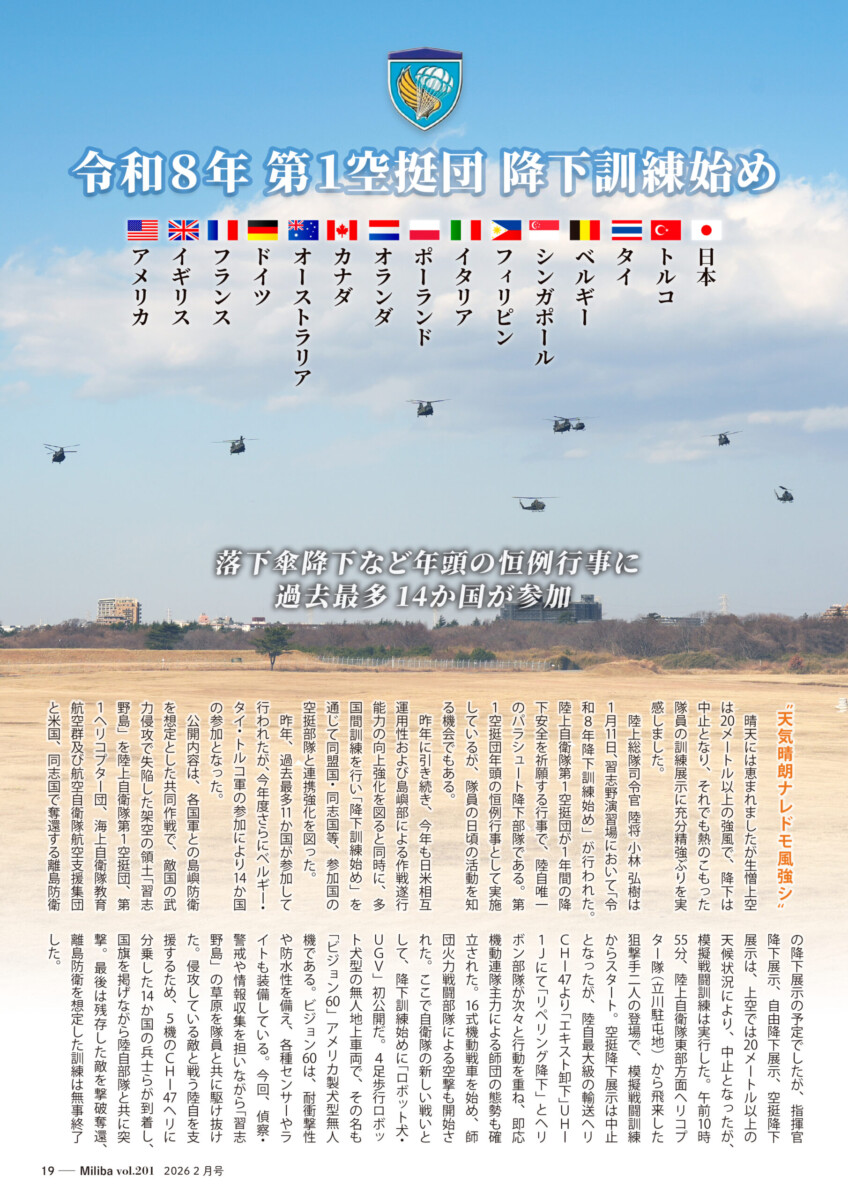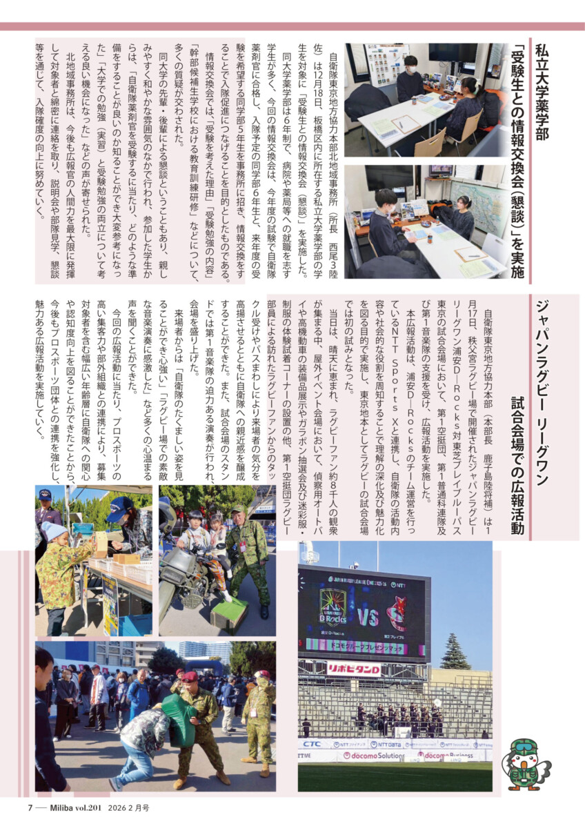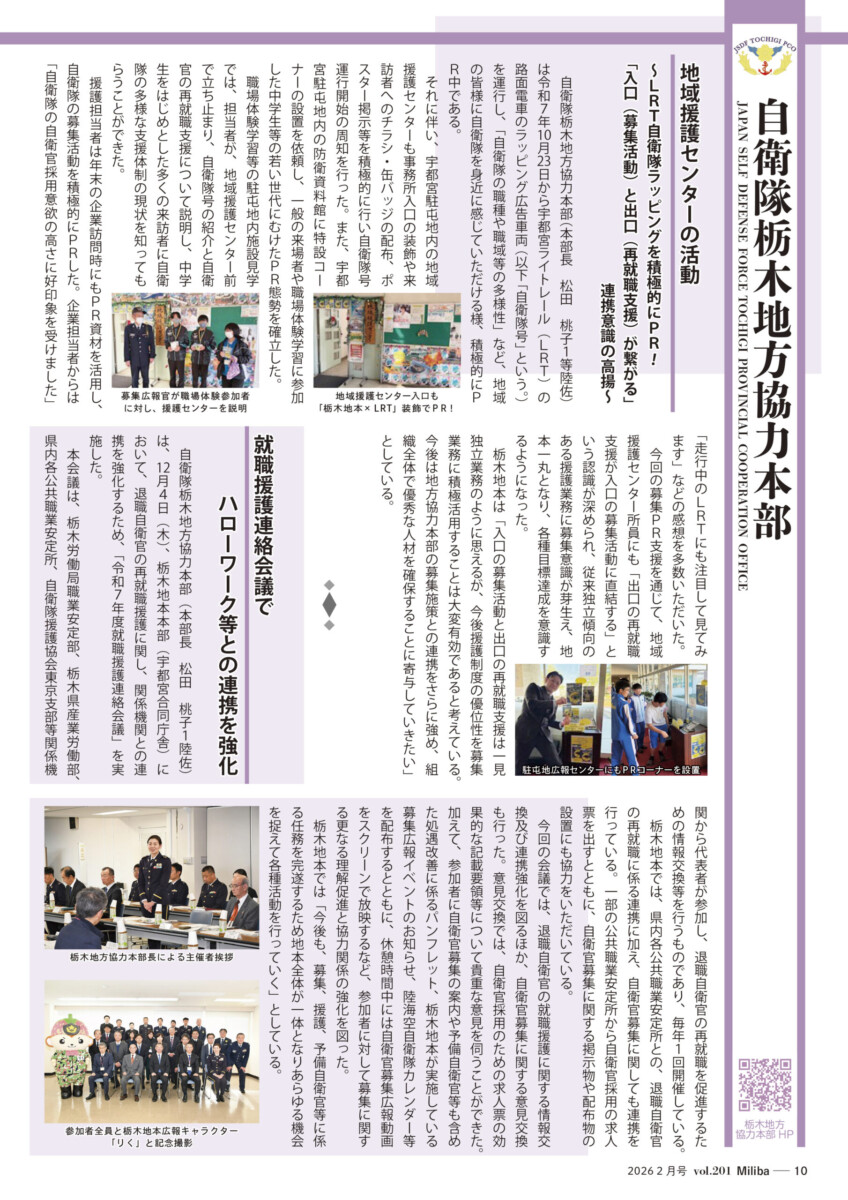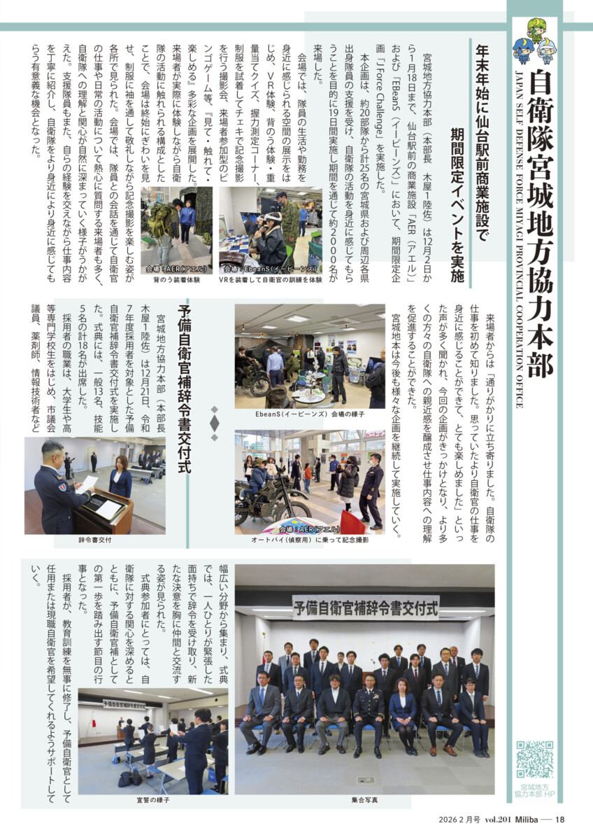 Vol.201(2026年 2月号) 2026/02/10 2026年2月号(令和8年2月号) 自衛隊情報誌Miliba2月号を公開しました❣ 陸上自衛隊広報センター「りっくんランド」はじめ全国各地の自衛隊地方協力本部などにて設置・配布中です。