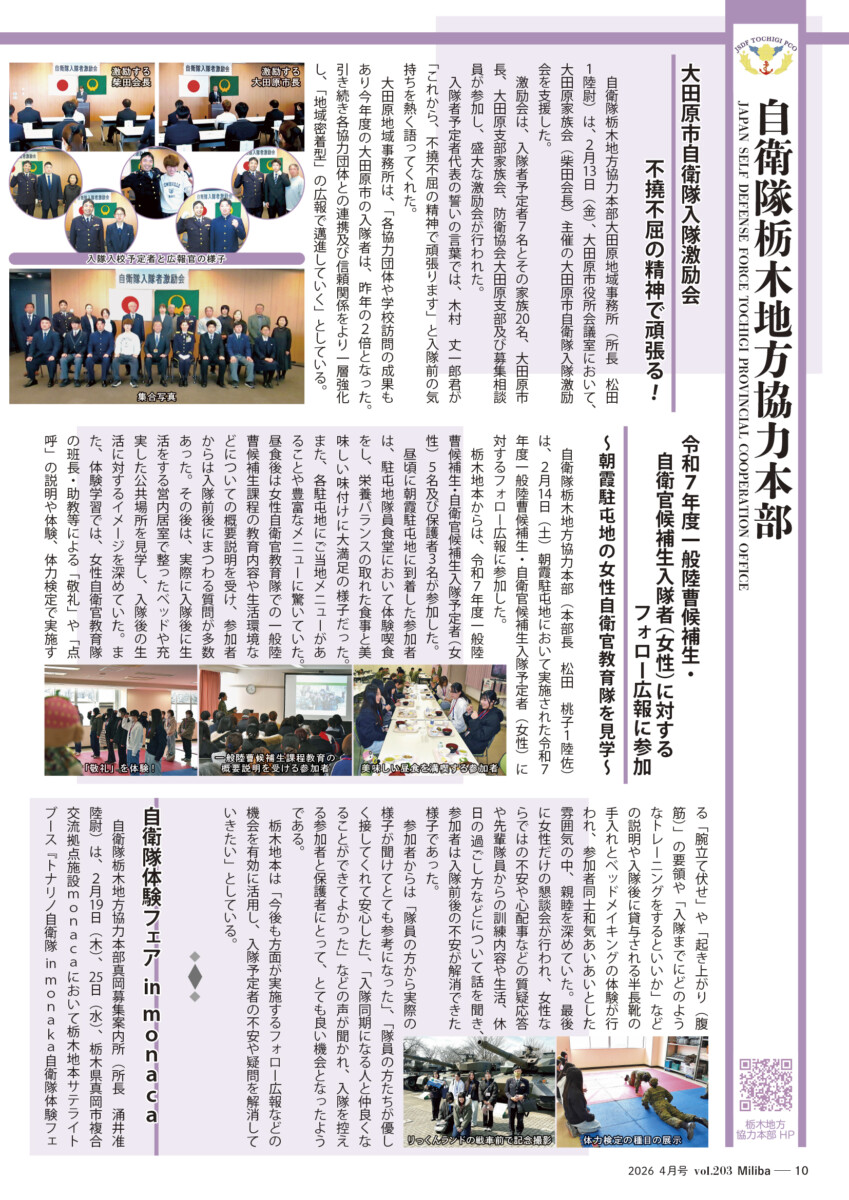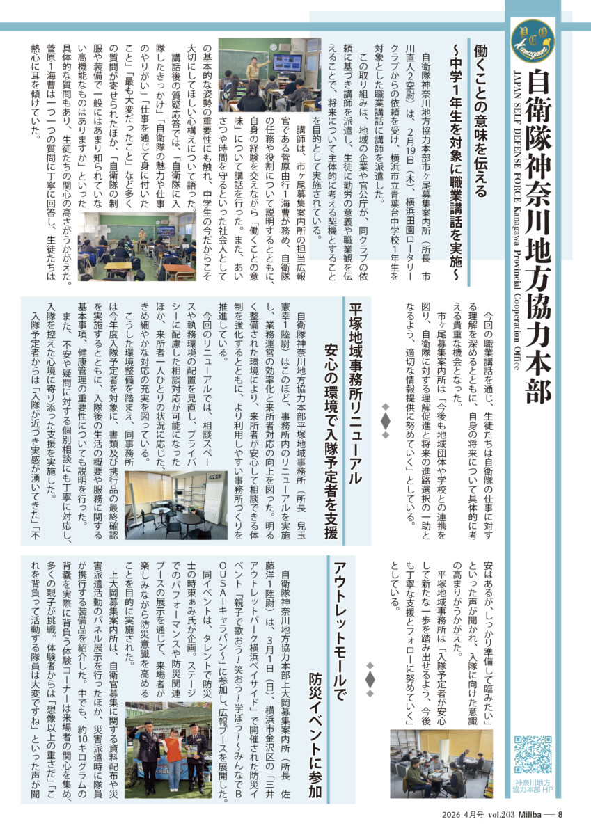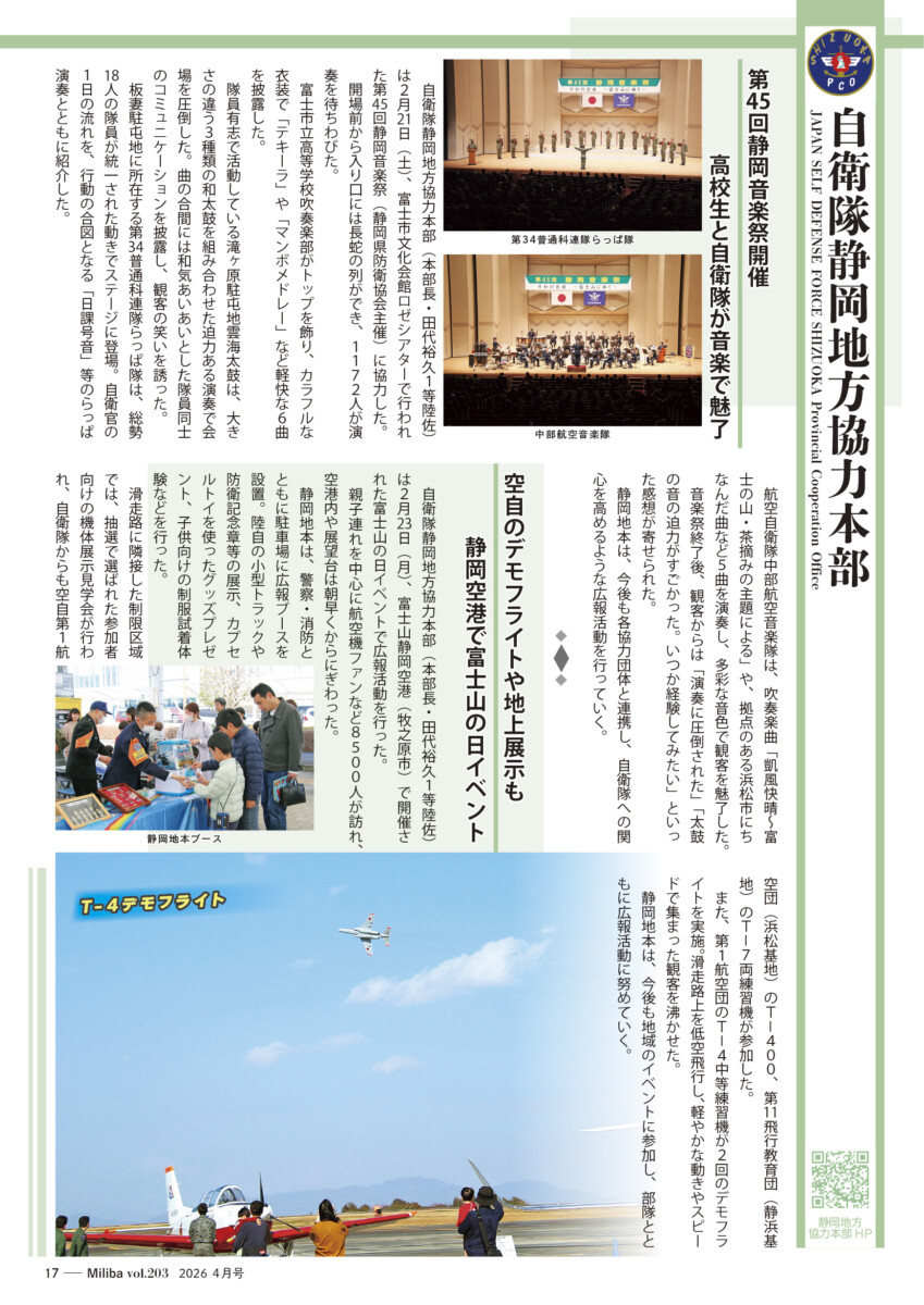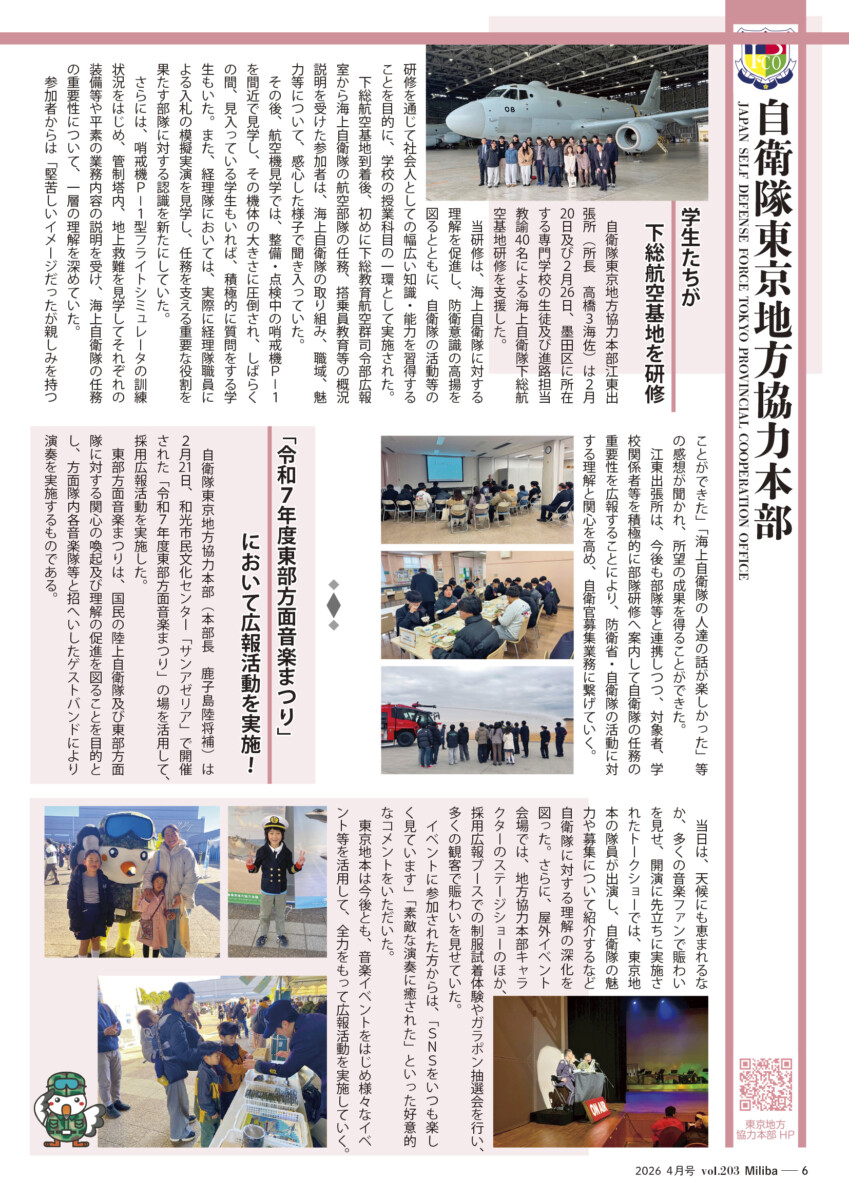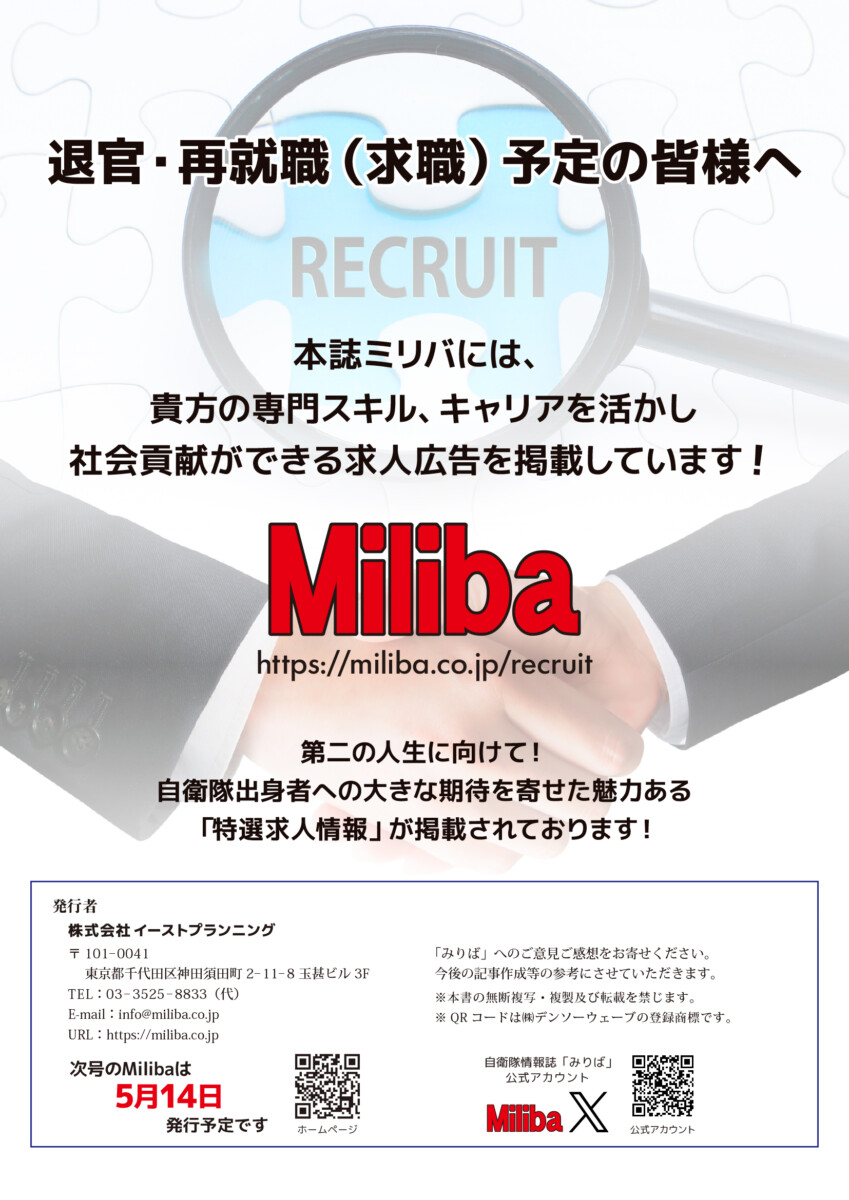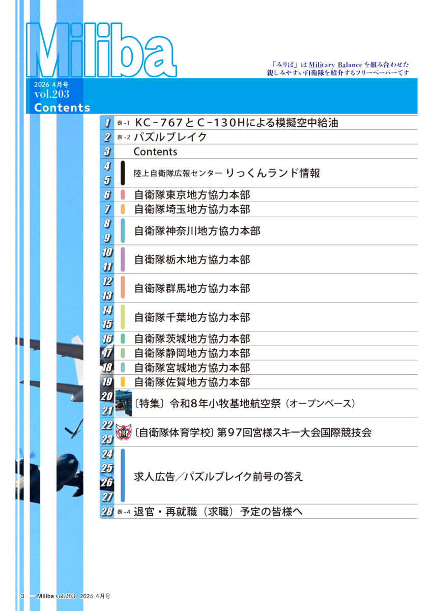 Vol.203(2026年 4月号) 2026/04/10 2026年4月号(令和8年4月号) 自衛隊情報誌Miliba4月号を公開しました❣ 陸上自衛隊広報センター「りっくんランド」はじめ全国各地の自衛隊地方協力本部などにて設置・配布中です。