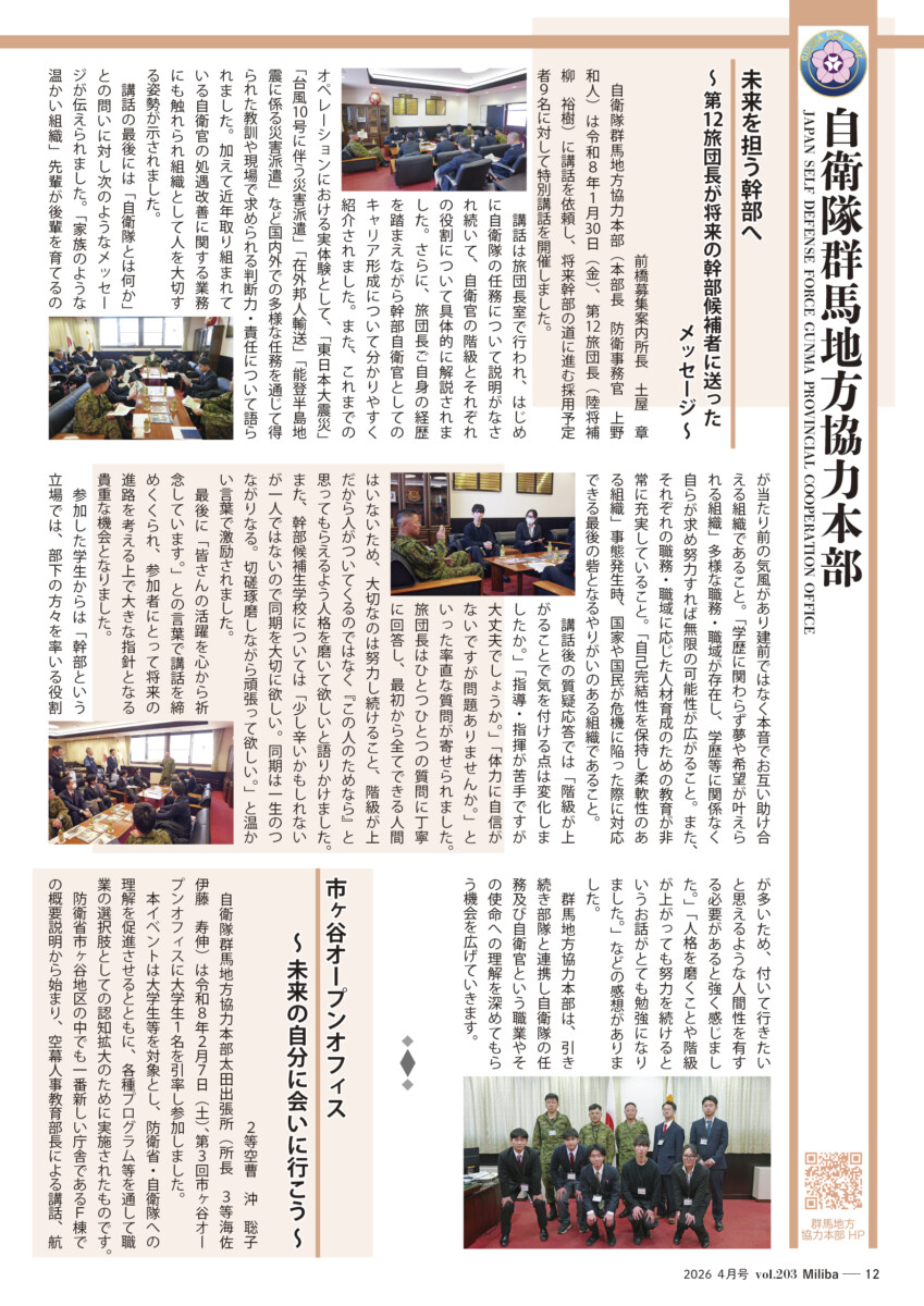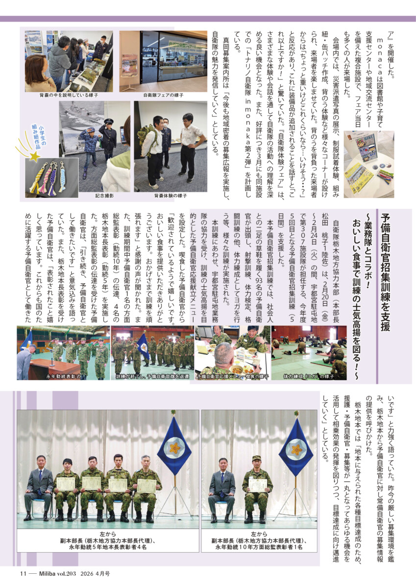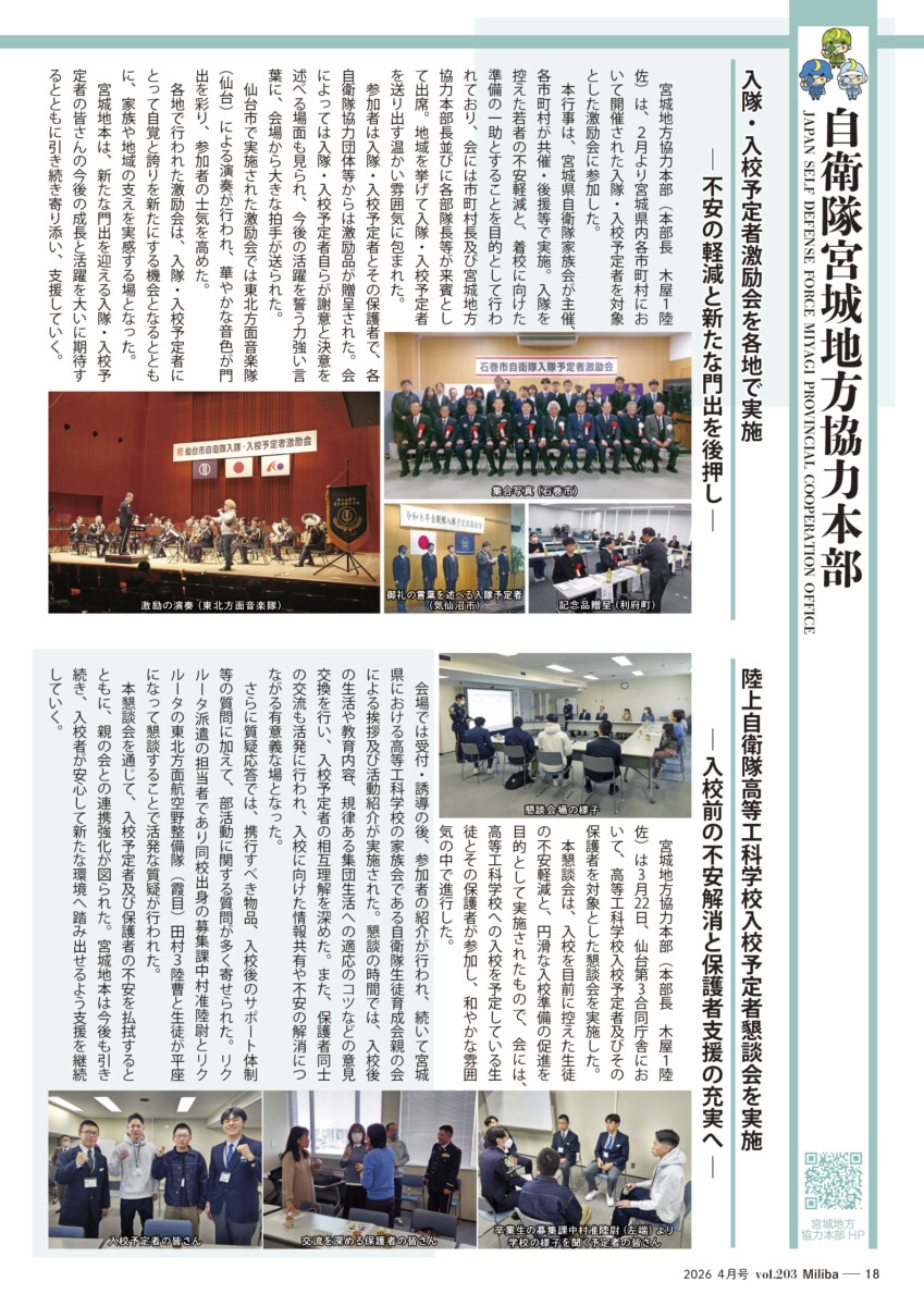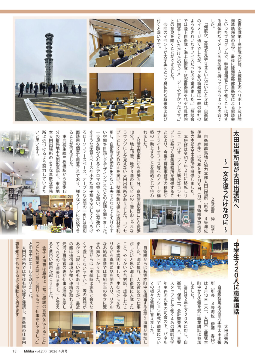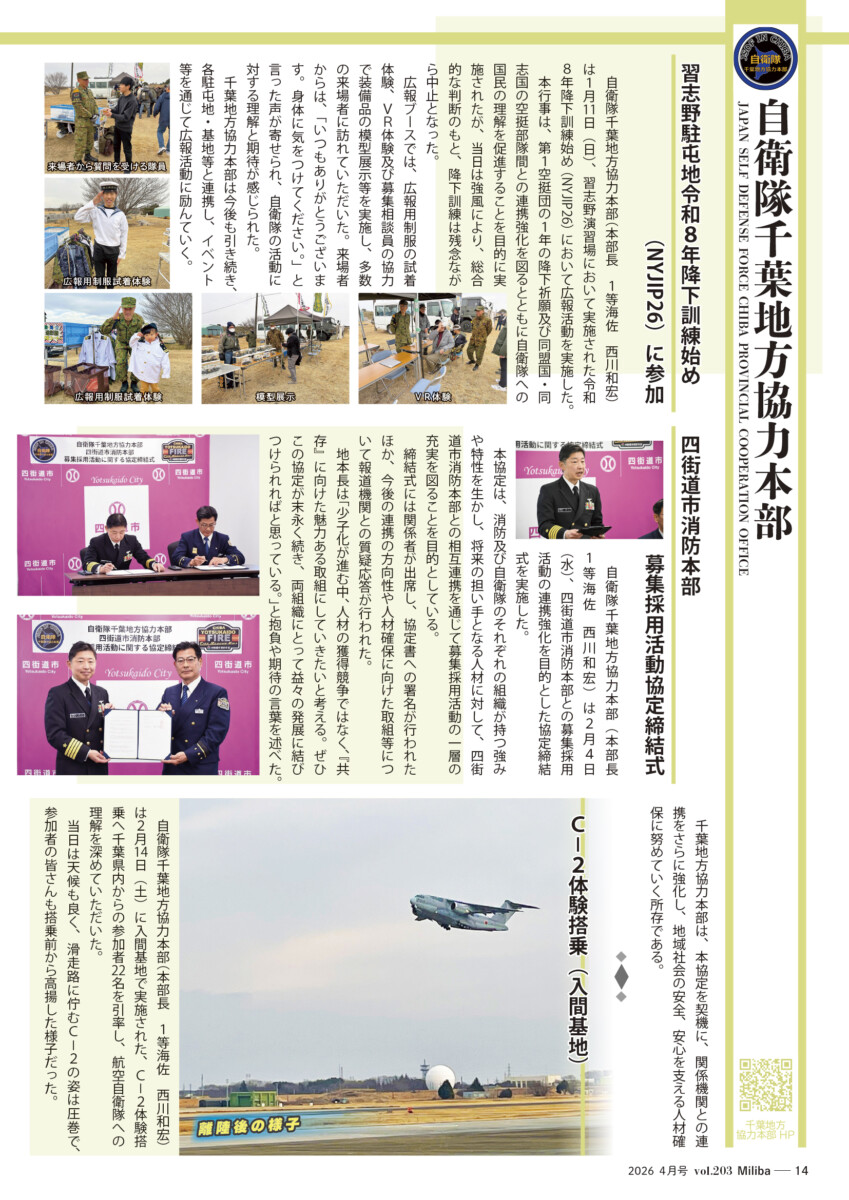 Vol.203(2026年 4月号) 2026/04/10 2026年4月号(令和8年4月号) 自衛隊情報誌Miliba4月号を公開しました❣ 陸上自衛隊広報センター「りっくんランド」はじめ全国各地の自衛隊地方協力本部などにて設置・配布中です。