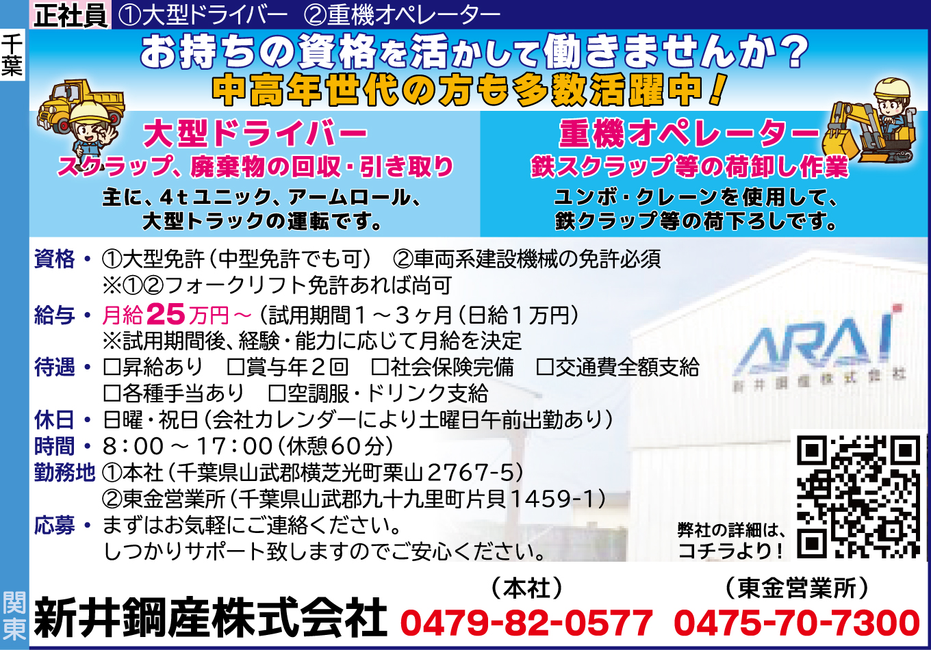 | 仕事内容詳細 | 中高年世代の方も多数活躍中! お持ちの資格を活かして働きませんか? 職種/ 正社員 ①大型ドライバー★スクラップ、廃棄物の回収・引き取り主に、4tユニック、アームロール、大型トラックの運転です。 正社員 ②重機オペレーター★鉄スクラップ等の荷卸し作業 ユンボ・クレーンを使用して、鉄クラップ等の荷下ろしです。 資格/ ①大型免許(中型免許でも可) ②車両系建設機械の免許必須 ※①②フォークリフト免許あれば尚可 給与/ 月給25万円~(試用期間1~3ヶ月(日給1万円) ※試用期間後、経験・能力に応じて月給を決定 待遇/ □昇給あり □賞与年2回 □社会保険完備 □交通費全額支給 □各種手当あり □空調服・ドリンク支給 休日/ 日曜・祝日(会社カレンダーにより土曜日午前出勤あり) 時間/ 8:00~17:00(休憩60分) 勤務地/ ①本社(千葉県山武郡横芝光町栗山2767-5) ②東金営業所(千葉県山武郡九十九里町片貝1459-1) |