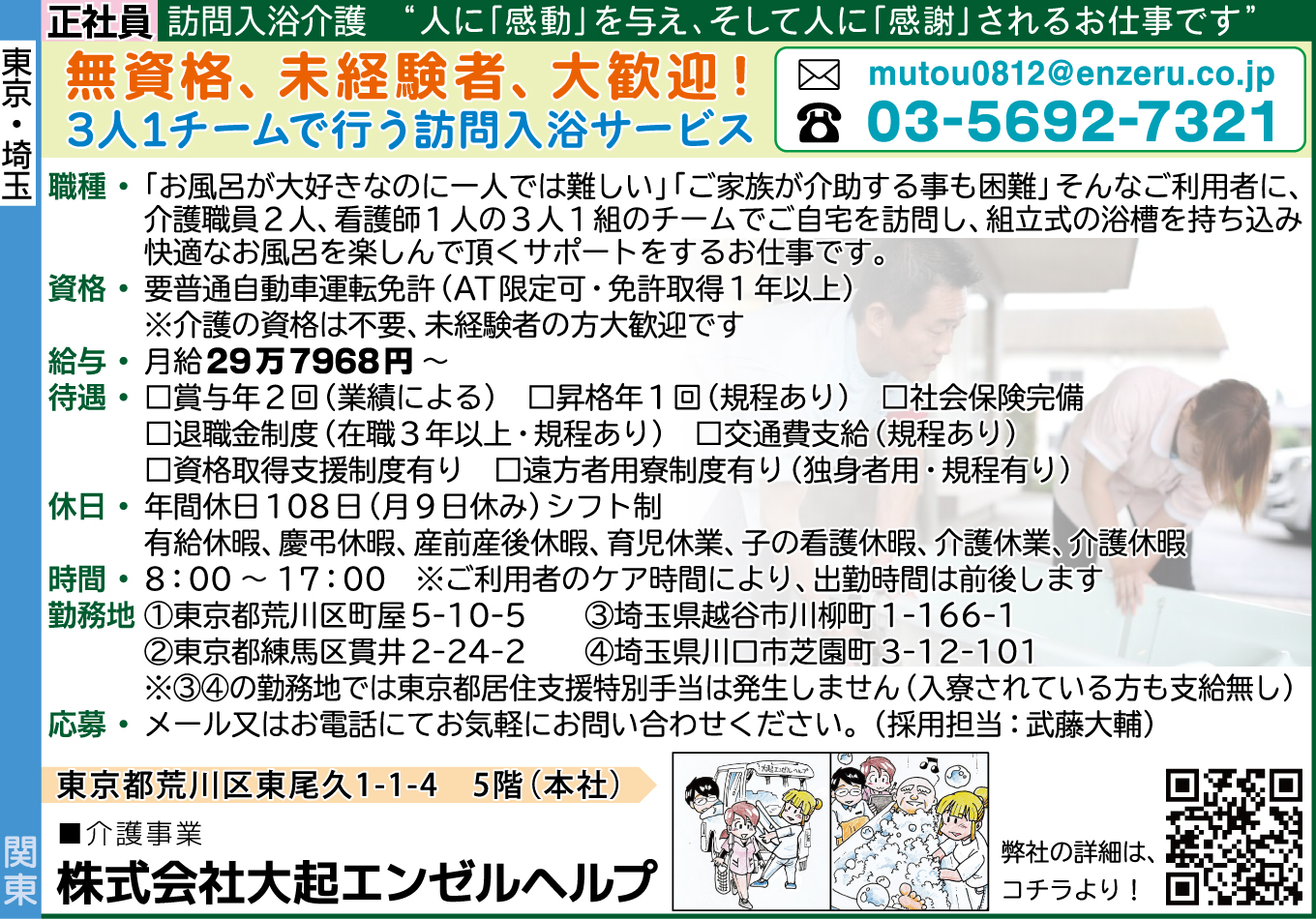 | 仕事内容詳細 | 無資格、未経験者、大歓迎! 3人1チームで行う訪問入浴サービス 職種/ 正社員 訪問入浴介護 “人に「感動」を与え、そして人に「感謝」されるお仕事です” 「お風呂が大好きなのに一人では難しい」「ご家族が介助する事も困難」そんなご利用者に、介護職員2人、看護師1人の3人1組のチームでご自宅を訪問し、組立式の浴槽を持ち込み快適なお風呂を楽しんで頂くサポートをするお仕事です。 資格/ 要普通自動車運転免許(AT限定可・免許取得1年以上) ※介護の資格は不要、未経験者の方大歓迎です 給与/ 月給29万7968円~ 待遇/ □賞与年2回(業績による) □昇格年1回(規程あり) □社会保険完備 □退職金制度(在職3年以上・規程あり) □交通費支給(規程あり) □資格取得支援制度有り □遠方者用寮制度有り(独身者用・規程有り) 休日/ 年間休日108日(月9日休み)シフト制 有給休暇、慶弔休暇、産前産後休暇、育児休業、子の看護休暇、介護休業、介護休暇 時間/ 8:00~17:00 ※ご利用者のケア時間により、出勤時間は前後します 勤務地/ ①東京都荒川区町屋5-10-5 ②東京都練馬区貫井2-24-2 ③埼玉県越谷市川柳町1-166-1 ④埼玉県川口市芝園町3-12-101 ※③④の勤務地では東京都居住支援特別手当は発生しません(入寮されている方も支給無し) |