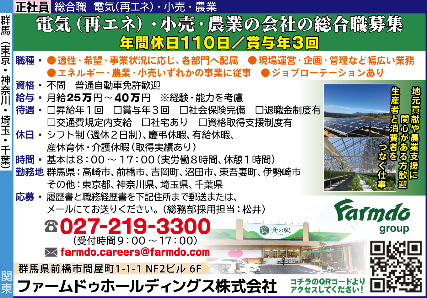 仕事内容詳細 | 電気(再エネ)・小売・農業の会社の総合職募集 年間休日110日/賞与年3回 【地元貢献や農業支援に関心がある方歓迎、生産者と消費者をつなぐ仕事】 職種/ 正社員 電気(再エネ)・小売・農業 総合職 • 適性・希望・事業状況に応じ、各部門へ配属 • 現場運営・企画・管理など幅広い業務 • エネルギー・農業・小売いずれかの事業に従事 • ジョブローテーションあり 資格/ 不問 普通自動車免許歓迎 給与/ 月給25万円~40万円 ※経験・能力を考慮 待遇/ □昇給年1回 □賞与年3回 □社会保険完備 □退職金制度有 □交通費規定内支給 □社宅あり □資格取得支援制度有 休日/ シフト制(週休2日制)、慶弔休暇、有給休暇、産休育休・介護休暇(取得実績あり) 時間/ 基本は8:00~17:00(実労働8時間、休憩1時間) 勤務地/ 群馬県:高崎市、前橋市、吉岡町、沼田市、東吾妻町、伊勢崎市 その他:東京都、神奈川県、埼玉県、千葉県 |