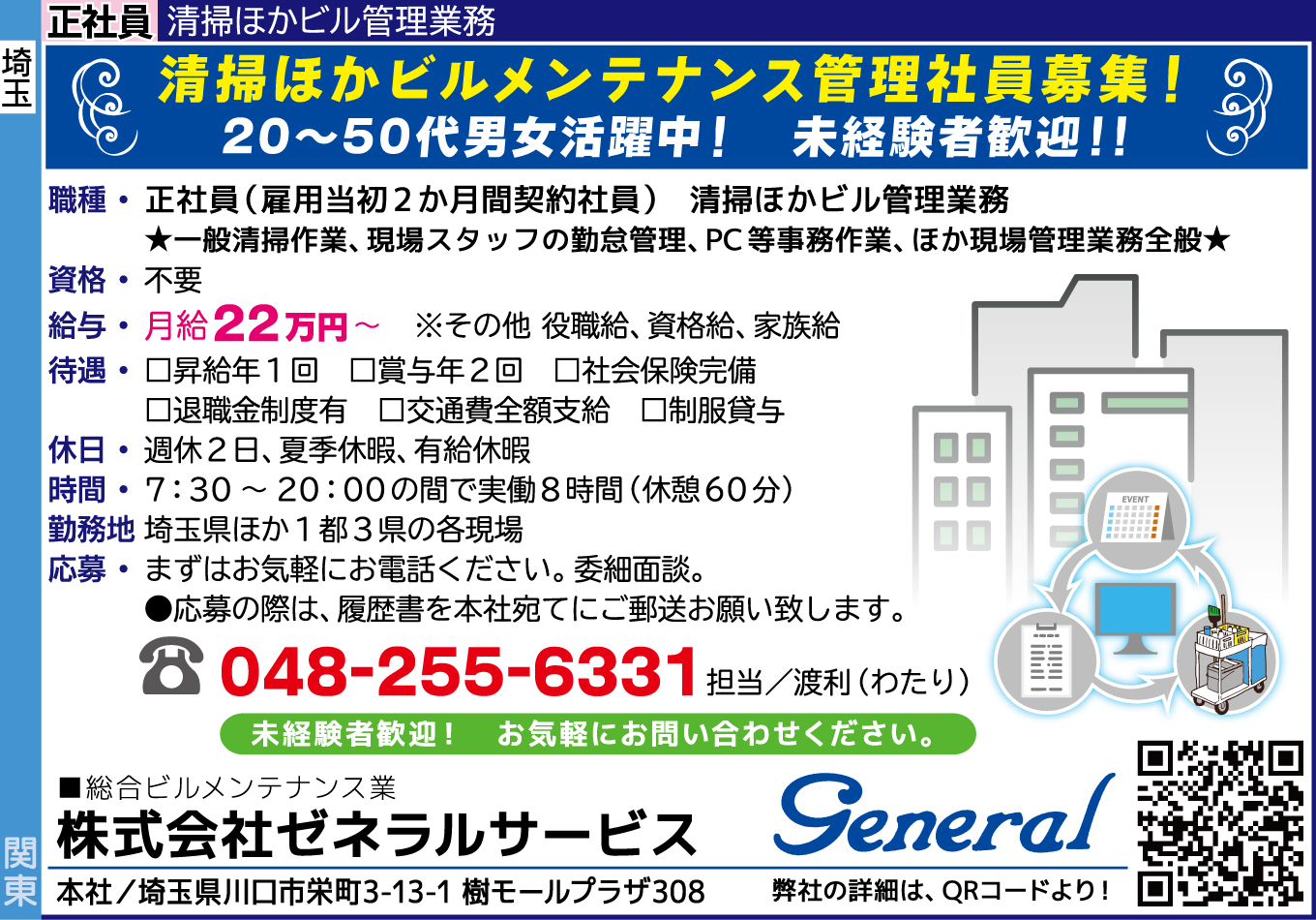 | 仕事内容詳細 | 清掃ほかビルメンテナンス管理社員募集! 20~50代男女活躍中! 未経験者歓迎!! 職種/ 正社員(雇用当初2か月間契約社員)清掃ほかビル管理業務★一般清掃作業、現場スタッフの勤怠管理、PC等事務作業、ほか現場管理業務全般★ 資格/ 不要 給与/ 月給22万円~ ※その他 役職給、資格給、家族給 待遇/ □昇給年1回 □賞与年2回 □社会保険完備 □退職金制度有 □交通費全額支給 □制服貸与 休日/ 週休2日、夏季休暇、有給休暇 時間/ 7:30~20:00の間で実働8時間(休憩60分) 勤務地/ 埼玉県ほか1都3県の各現場 |