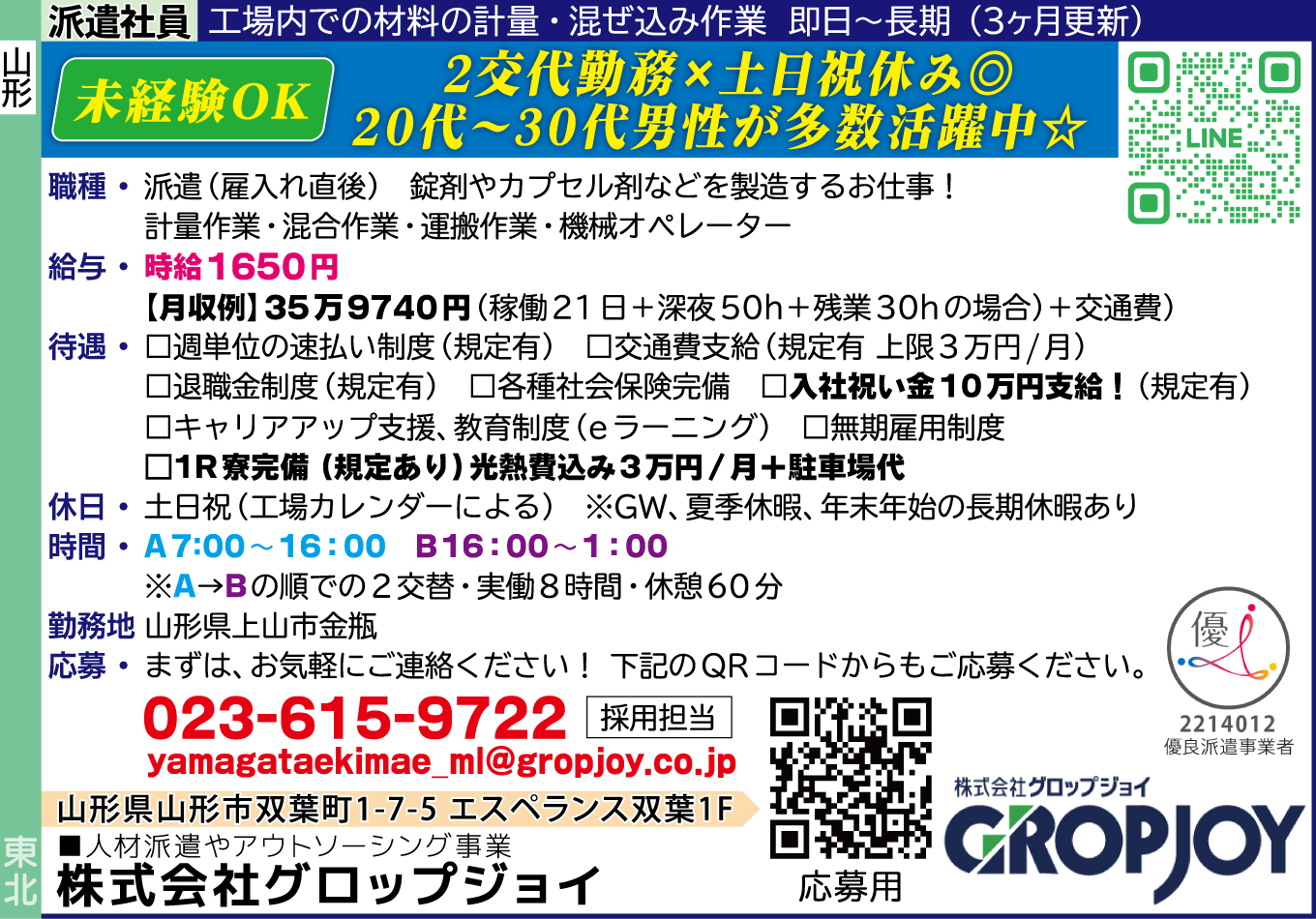 | 応募方法 | まずは、お気軽にご連絡ください! 電話:023-615-9722 メール:yamagataekimae_ml★gropjoy.co.jp 採用担当 ※メールにてご連絡いただく場合、上記メールアドレス中「★」を半角「@」に変更して送信下さい。 下記URLからもご応募ください。 |