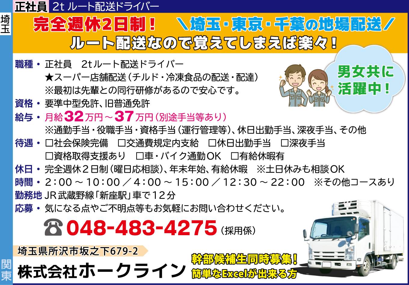 職種/ 正社員 2tルート配送ドライバー★スーパー店舗配送(チルド・冷凍食品の配送・配達)