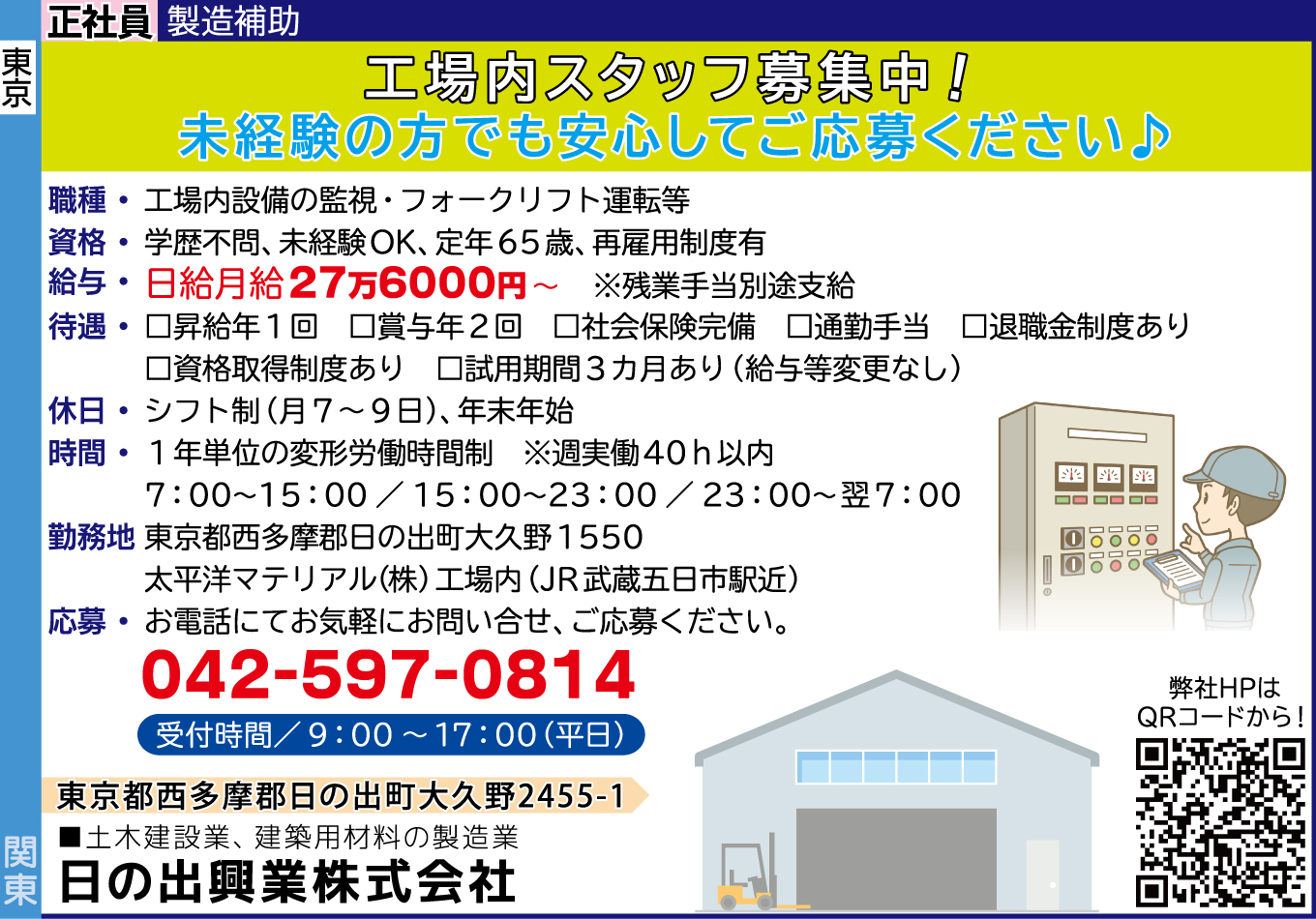 | 仕事内容詳細 | 工場内スタッフ募集中! 未経験の方でも安心してご応募ください♪ 職種/ 正社員 製造補助 工場内設備の監視・フォークリフト運転等 資格/ 学歴不問、未経験OK、定年65歳、再雇用制度有 給与/ 日給月給27万6000円~ ※残業手当別途支給 待遇/ □昇給年1回 □賞与年2回 □社会保険完備 □通勤手当 □退職金制度あり □資格取得制度あり □試用期間3カ月あり(給与等変更なし) 休日/ シフト制(月7~9日)、年末年始 時間/ 1年単位の変形労働時間制 ※週実働40h以内 7:00~15:00/15:00~23:00/23:00~翌7:00 勤務地/ 東京都西多摩郡日の出町大久野1550 太平洋マテリアル(株)工場内(JR武蔵五日市駅近) |