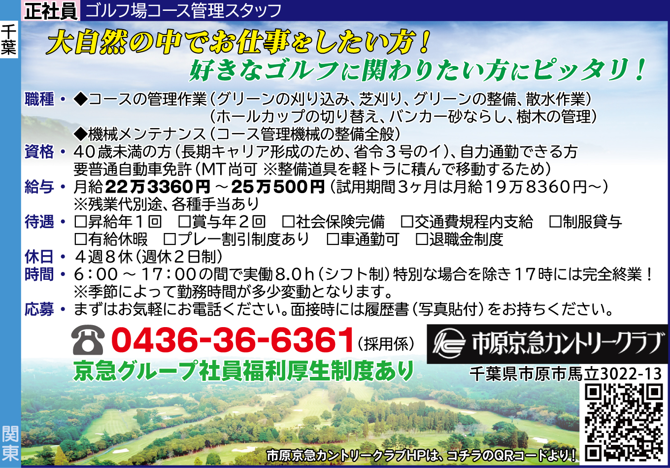 | 応募方法 | まずはお気軽にお電話ください。 面接時には履歴書(写真貼付)をお持ちください。 0436-36-6361 採用係 市原京急カントリークラブHPは、下記URLより! |