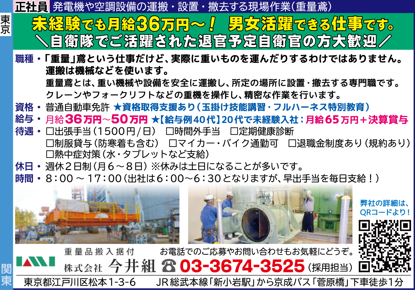 | 仕事内容詳細 | 未経験でも月給36万円~! 男女活躍できる仕事です。 自衛隊でご活躍された退官予定自衛官の方大歓迎 職種/ 正社員 発電機や空調設備の運搬・設置・撤去する現場作業(重量鳶) 「重量」鳶という仕事だけど、実際に重いものを運んだりするわけではありません。運搬は機械などを使います。 重量鳶(じゅうりょうとび)とは、重い機械や設備を安全に運搬し、所定の場所に設置・撤去する専門職です。 クレーンやフォークリフトなどの重機を操作し、精密な作業を行います。 資格/ 普通自動車免許 ★資格取得支援あり(玉掛け技能講習・フルハーネス特別教育) 給与/ 月給36万円~50万円 ★【給与例40代】20代で未経験入社:月給65万円+決算賞与 待遇/ □出張手当(1500円/日) □時間外手当 □定期健康診断 □制服貸与(防寒着も含む) □マイカー・バイク通勤可 □退職金制度あり(規約あり) □熱中症対策(水・タブレットなど支給) 休日/ 週休2日制(月6~8日) ※休みは土日になることが多いです。 時間/ 8:00~17:00 ※出社は6:00〜6:30となりますが、早出手当を毎日支給! 勤務地/ JR総武本線「新小岩駅」から京成バス「菅原橋」下車徒歩1分 |