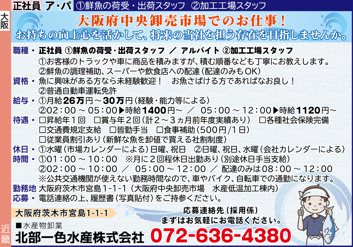 大阪府茨木市宮島1-1-1 (大阪府中央卸売市場 水産低温加工棟内) |