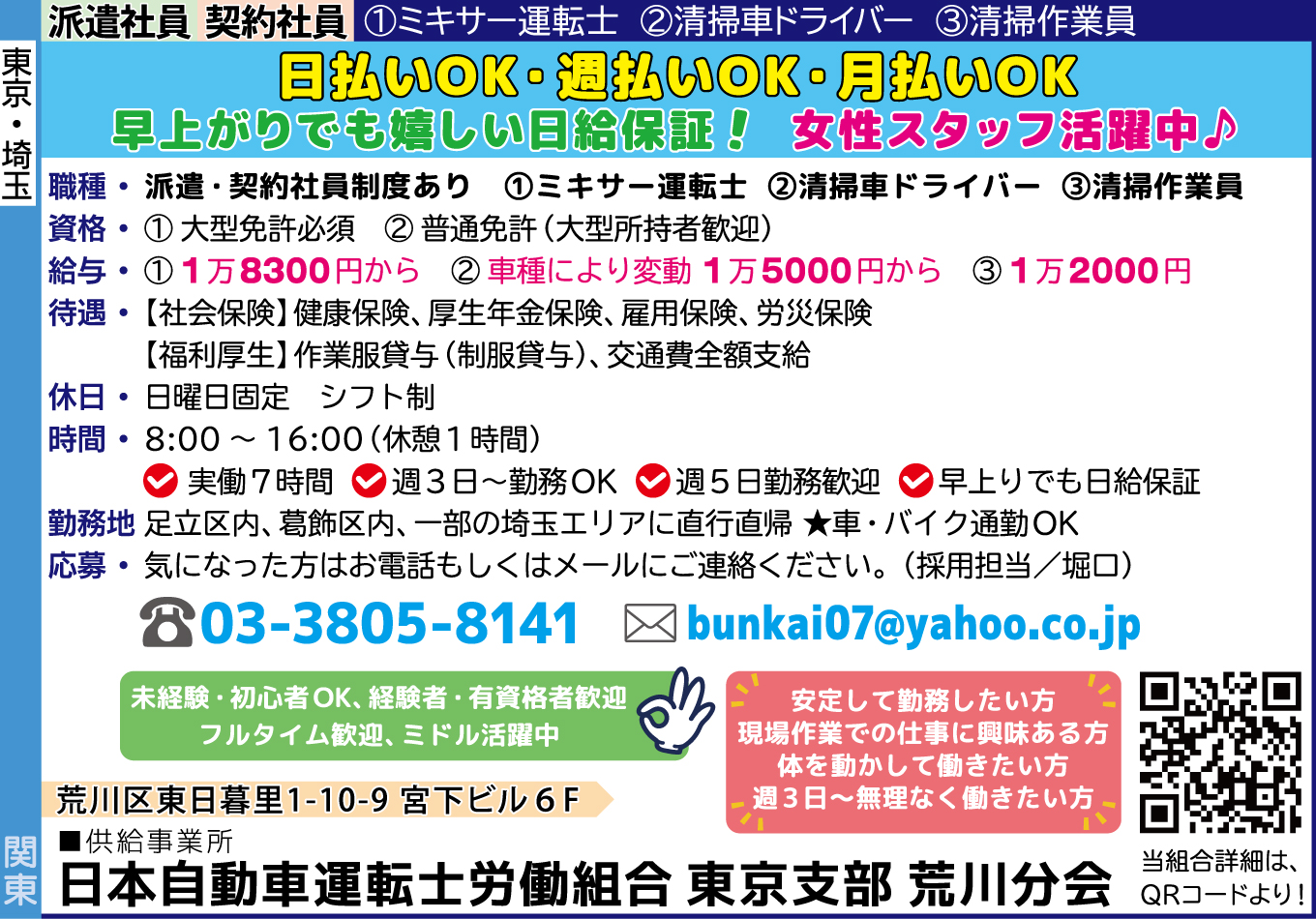 | 仕事内容詳細 | ⭐日払いOK・週払いOK・月払いOK ⭐早上がりでも嬉しい日給保証! ⭐女性スタッフ活躍中♪ ✨未経験・初心者OK ✨経験者・有資格者歓迎 ✨フルタイム歓迎 ✨ミドル活躍中 <下記に1つでも当てはまる方歓迎> ⏩安定して勤務したい方 ⏩現場作業での仕事に興味ある方 ⏩体を動かして働きたい方 ⏩週3日~無理なく働きたい方 職種/ 派遣・契約社員制度あり ①ミキサー運転士 ②清掃車ドライバー ③清掃作業員 資格/ ①大型免許必須 ②普通免許(大型所持者歓迎) 給与/ ①1万8300円から ②車種により変動 1万5000円から ③1万2000円 待遇/ 【社会保険】健康保険、厚生年金保険、雇用保険、労災保険 【福利厚生】作業服貸与(制服貸与)、交通費全額支給 休日/ 日曜日固定 シフト制 時間/ ⏰8:00~16:00(休憩1時間) ✅実働7時間 ✅週3日~勤務OK ✅週5日勤務歓迎 ✅早上りでも日給保証 勤務地/ 足立区内、葛飾区内、一部の埼玉エリアに直行直帰 ★車・バイク通勤OK |
