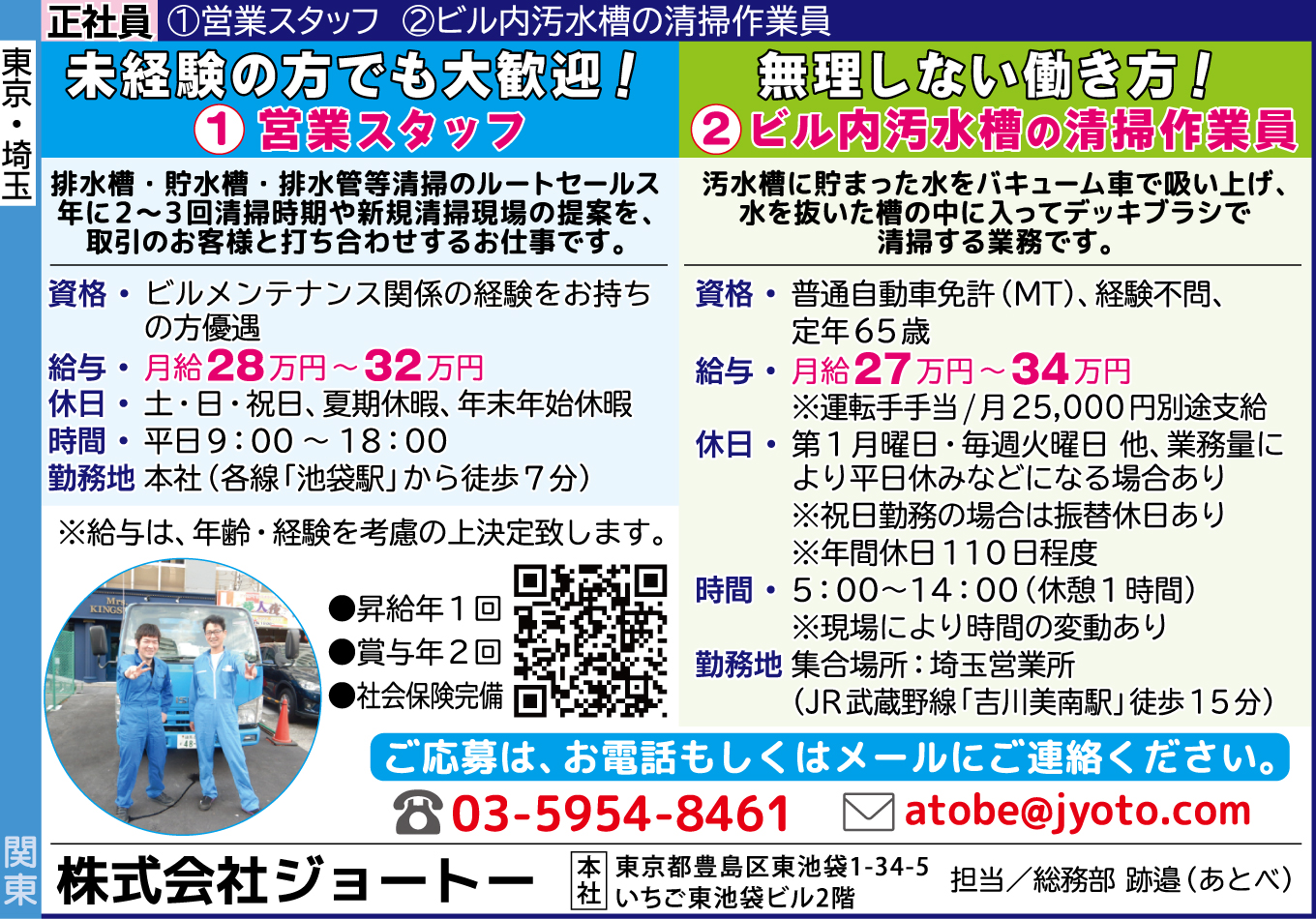| 仕事内容詳細 | 職種/正社員 ①営業スタッフ未経験の方でも大歓迎!排水槽・貯水槽・排水管等清掃のルートセールス 年に2~3回清掃時期や新規清掃現場の提案を、取引のお客様と打ち合わせするお仕事です。 職種/正社員 ②ビル内汚水槽の清掃作業員無理しない働き方!汚水槽に貯まった水をバキューム車で吸い上げ、水を抜いた槽の中に入ってデッキブラシで清掃する業務です。 資格/ ①ビルメンテナンス関係の経験をお持ちの方優遇 ②普通自動車免許(MT)、経験不問、定年65歳 給与/ ①月給28万円~32万円 ②月給27万円〜34万円(運転手手当/月25,000円別途支給) ※①②給与は年齢・経験を考慮の上決定致します。 待遇/ □昇給年1回 □賞与年2回 □社会保険完備 休日/ ①土・日・祝日、夏期休暇、年末年始休暇 ②第1月曜日・毎週火曜日 他、業務量により平日休みなどになる場合あり ※祝日勤務の場合は振替休日あり ※年間休日110日程度 時間/ ①平日9:00~18:00 ②5:00〜14:00(休憩1時間)※現場により時間の変動あり 勤務地/ ①本社(各線「池袋駅」から徒歩7分) ②集合場所:埼玉営業所(JR武蔵野線「吉川美南駅」徒歩15分) |
