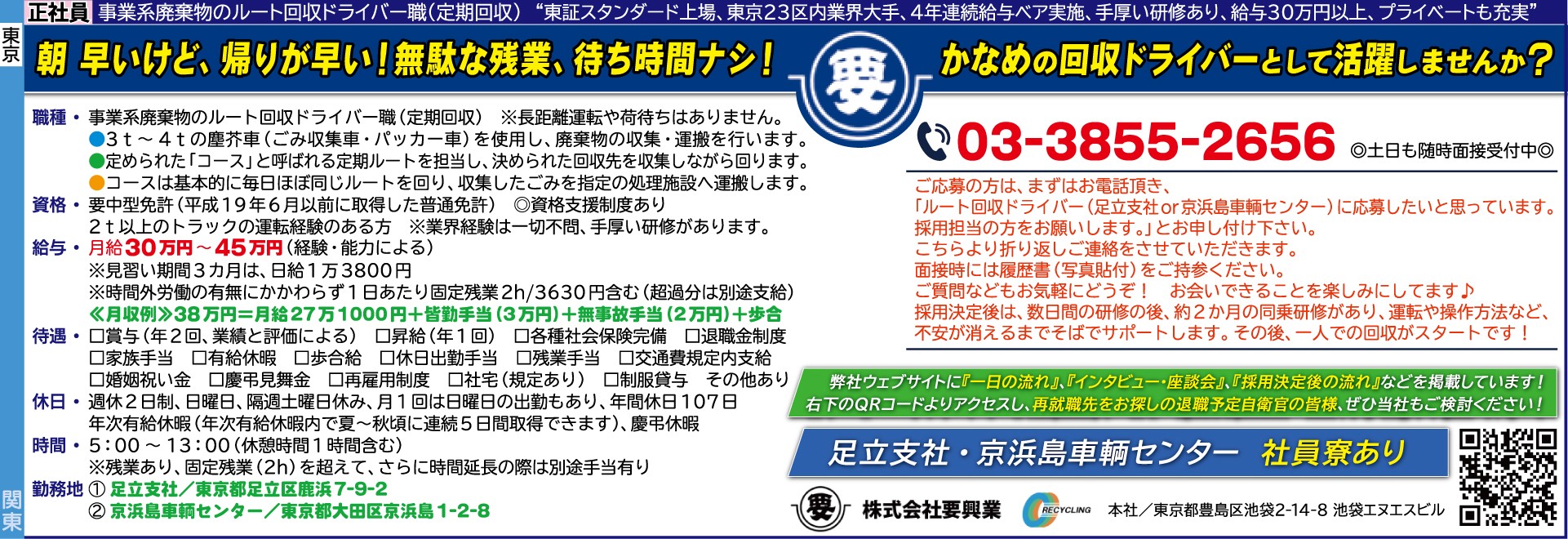| 応募方法 | ご応募の方は、まずはお電話頂き、 「ルート回収ドライバー(足立支社or京浜島車輌センター)に応募したいと思っています。 採用担当の方をお願いします。」とお申し付け下さい。 こちらより折り返しご連絡をさせていただきます。 面接時には履歴書(写真貼付)をご持参ください。 ご質問などもお気軽にどうぞ! お会いできることを楽しみにしてます♪ 採用決定後は、数日間の研修の後、約2か月の同乗研修があり、運転や操作方法など、不安が消えるまでそばでサポートします。その後、一人での回収がスタートです! 03-3855-2656 ◎土日も随時面接受付中◎ 弊社ウェブサイトに『一日の流れ』、『インタビュー・座談会』、『採用決定後の流れ』などを掲載しています! 下記URLよりアクセスし、再就職先をお探しの退職予定自衛官の皆様、ぜひ当社もご検討ください! |