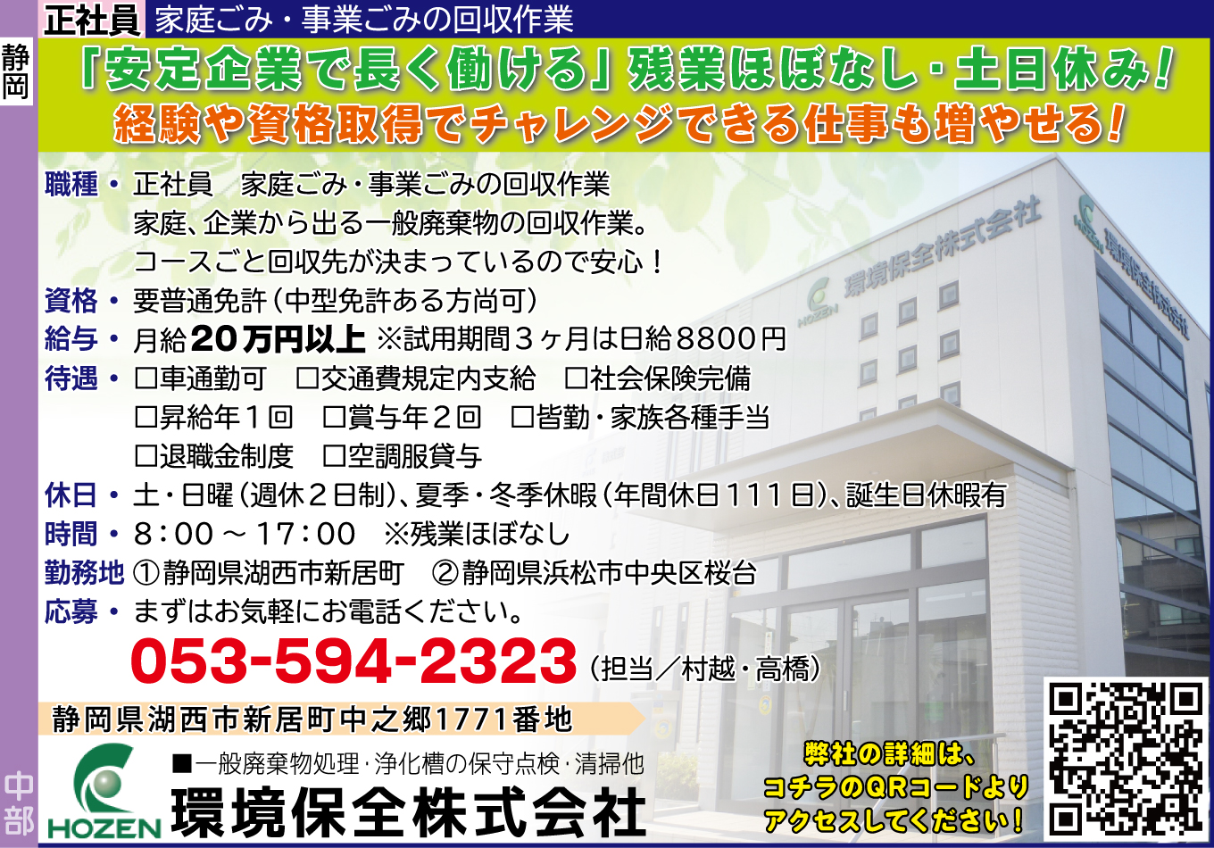 | 仕事内容詳細 | 「安定企業で長く働ける」残業ほぼなし・土日休み! 経験や資格取得でチャレンジできる仕事も増やせる! 職種/ 正社員 家庭ごみ・事業ごみの回収作業 家庭、企業から出る一般廃棄物の回収作業。 コースごと回収先が決まっているので安心! 資格/ 要普通免許 中型免許ある方尚可 給与/ 月給20万円以上 ※試用期間3ヶ月は日給8800円 待遇/ □車通勤可 □交通費規定内支給 □社会保険完備 □昇給年1回 □賞与年2回 □皆勤・家族各種手当 □退職金制度 □空調服貸与 休日/ 土・日曜(週休2日制)、夏季・冬季休暇(年間休日111日)、誕生日休暇有 時間/ 8:00~17:00 ※残業ほぼなし 勤務地/ ①静岡県湖西市新居町 ②静岡県浜松市中央区桜台 |