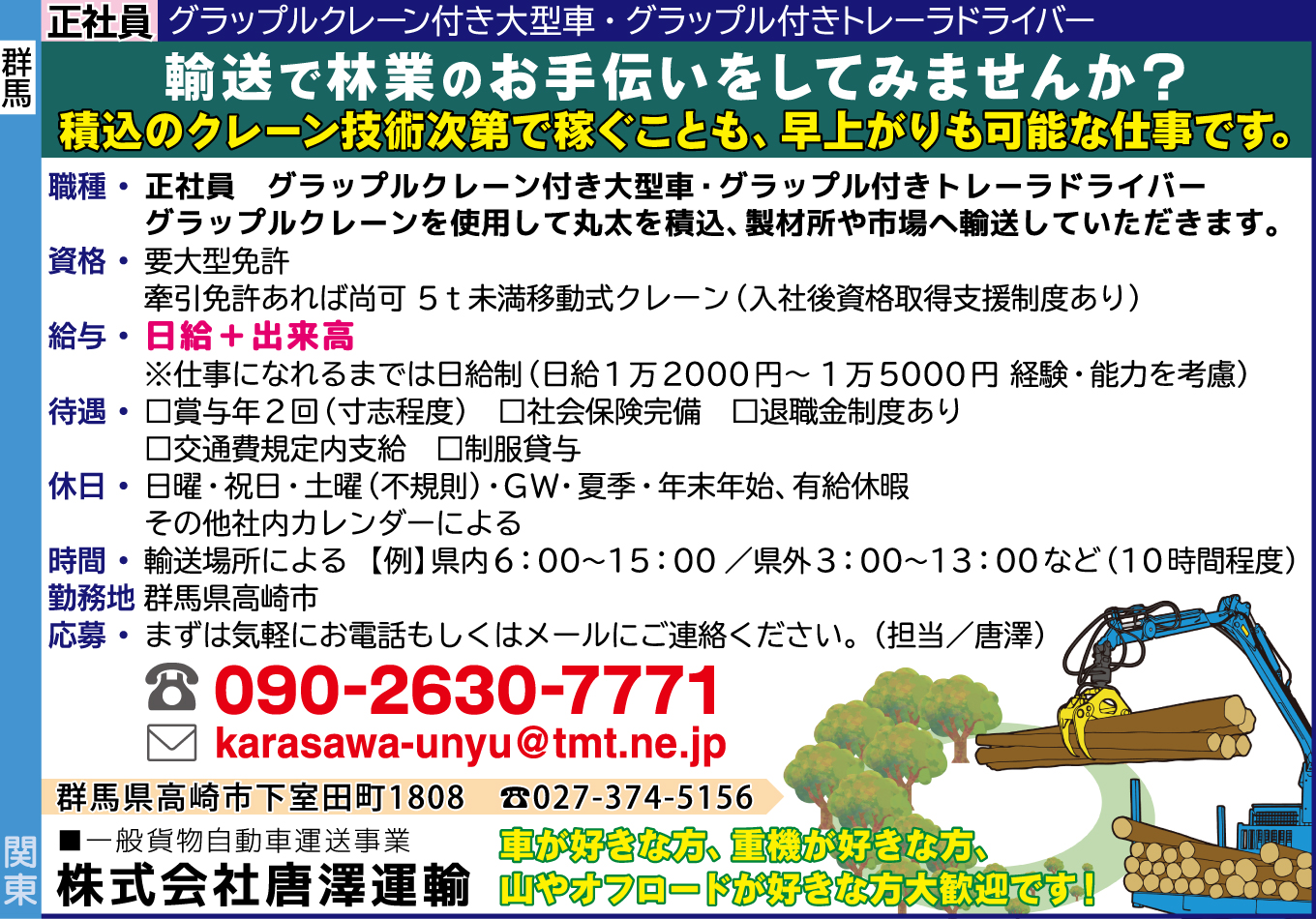 正社員 グラップルクレーン付き大型車・グラップル付きトレーラドライバー