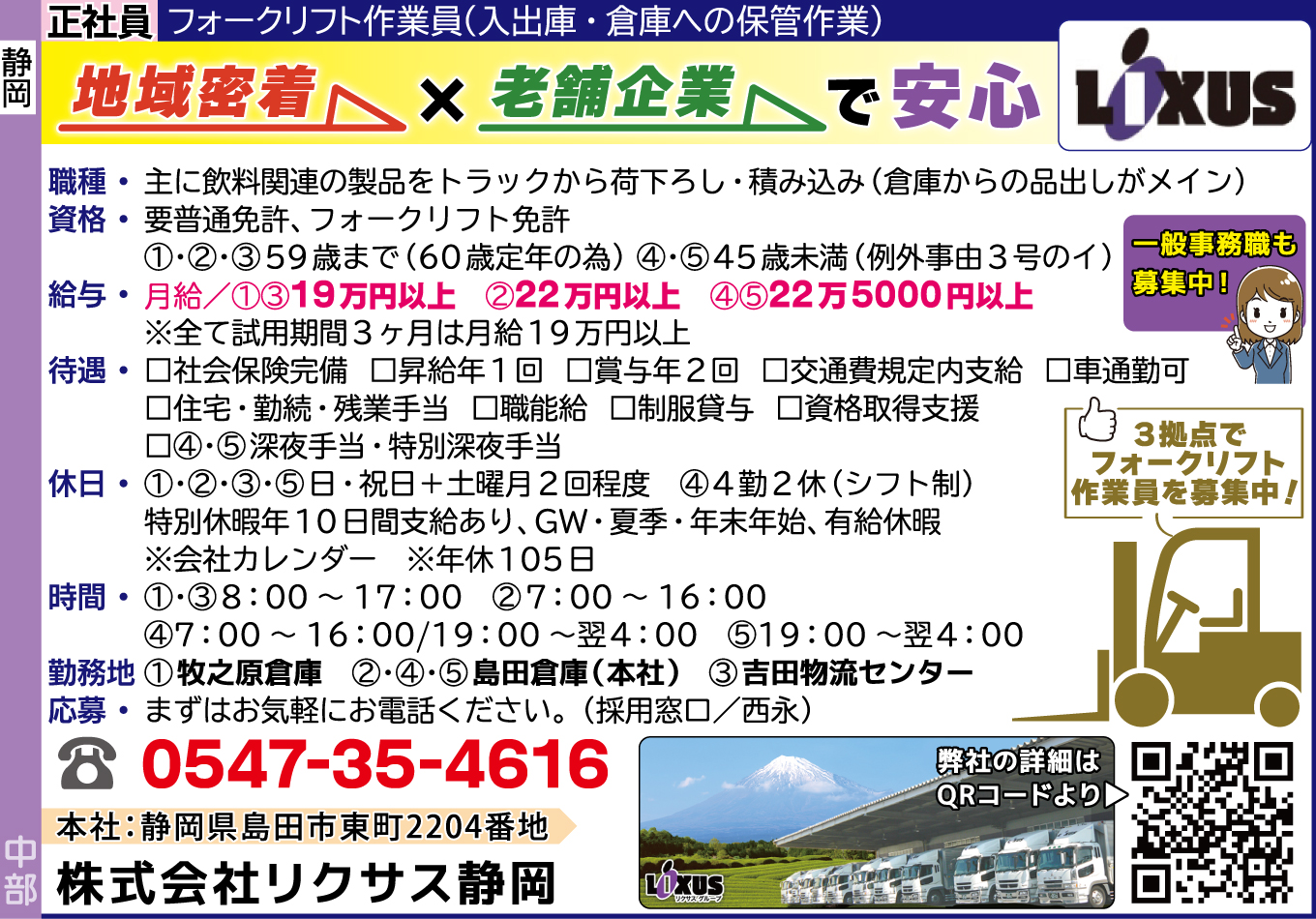 | 応募方法 | まずはお気軽にお電話ください。 0547-35-4616 採用窓口/西永 弊社の詳細は、下記URLより! |