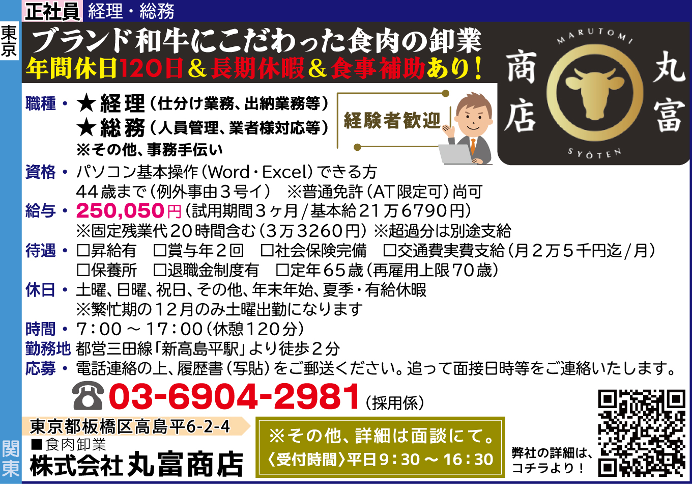 | 仕事内容詳細 | ブランド和牛にこだわった食肉の卸業 年間休日120日&長期休暇&食事補助あり! 経験者歓迎! 職種/正社員★経理(仕分け業務、出納業務等)★総務(人員管理、業者様対応等) ※その他、事務手伝い 資格/ パソコン基本操作(Word・Excel)できる方 44歳まで(例外事由3号イ) ※普通免許(AT限定可)尚可 給与/ 250,050円(試用期間3ヶ月/基本給21万6790円) ※固定残業代20時間含む(3万3260円)※超過分は別途支給 待遇/ □昇給有 □賞与年2回 □社会保険完備 □交通費実費支給(月2万5千円迄/月) □保養所 □退職金制度有 □定年65歳(再雇用上限70歳) 休日/ 土曜、日曜、祝日、その他、年末年始、夏季・有給休暇 ※繁忙期の12月のみ土曜出勤になります 時間/ 7:00~17:00(休憩120分) 勤務地/ 都営三田線「新高島平駅」より徒歩2分 |