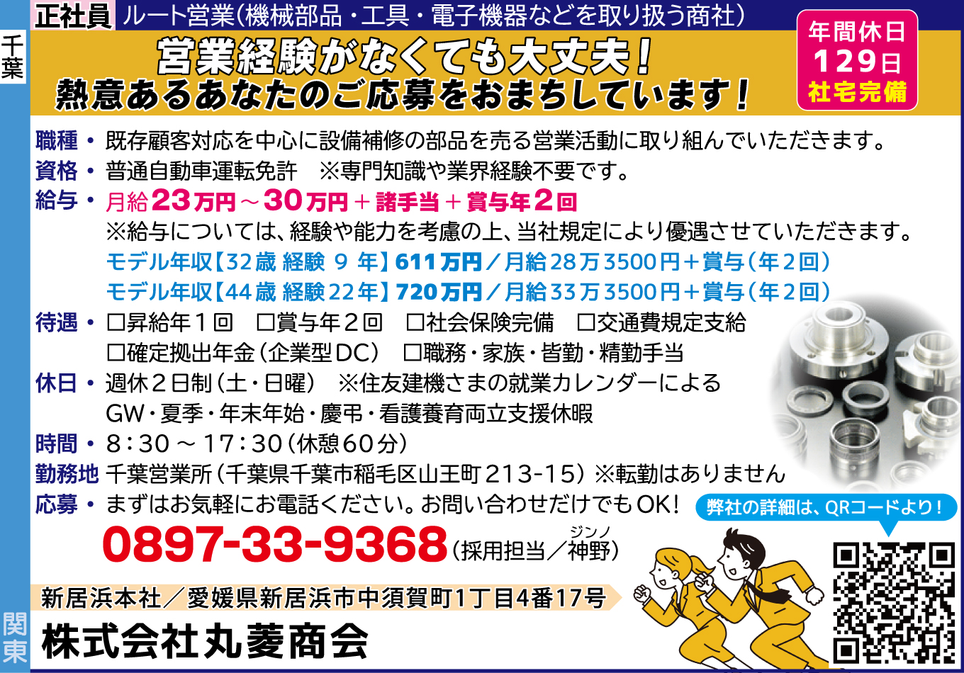 | 仕事内容詳細 | 営業経験がなくても大丈夫! 熱意あるあなたのご応募をおまちしています! ☆年間休日129日 ☆社宅完備 職種/ 正社員 ルート営業(機械部品・工具・電子機器などを取り扱う商社) 既存顧客対応を中心に設備補修の部品を売る営業活動に取り組んでいただきます。 資格/ 普通自動車運転免許 ※専門知識や業界経験不要です。 給与/ 月給23万円~30万円+諸手当+賞与年2回 ※給与については、経験や能力を考慮の上、当社規定により優遇させていただきます。 モデル年収【32歳 経験9年】611万円/月給28万3500円+賞与(年2回) モデル年収【44歳 経験22年】720万円/月給33万3500円+賞与(年2回) 待遇/ □昇給年1回 □賞与年2回 □社会保険完備 □交通費規定支給 □確定拠出年金(企業型DC) □職務・家族・皆勤・精勤手当 休日/ 週休2日制(土・日曜) ※住友建機さまの就業カレンダーによる GW・夏季・年末年始・慶弔・看護養育両立支援休暇 時間/ 8:30~17:30(休憩60分) 勤務地/ 千葉営業所(千葉県千葉市稲毛区山王町213-15) ※転勤はありません |