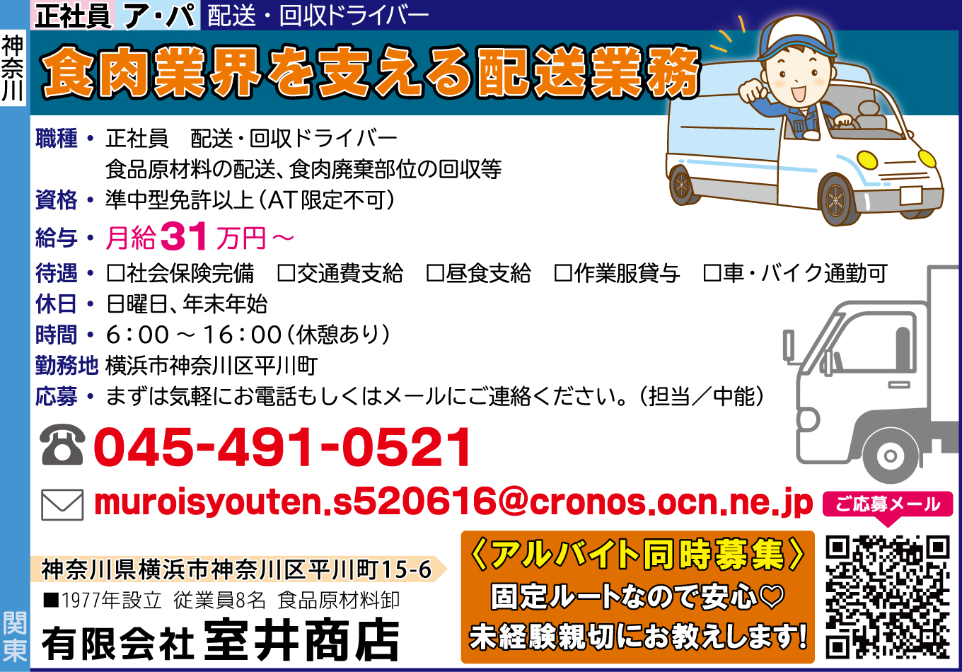 有限会社 室井商店 職種 ドライバー・他車両 仕事内容詳細 食肉業界を支える配送業務 職種/正社員 配送・回収ドライバー食品原材料の配送、食肉廃棄部位の回収等 資格/ 準中型免許以上(AT限定不可) 給与/ 月給31万円~ 待遇/ □社会保険完備 □交通費支給 □昼食支給 □作業服貸与 □車・バイク通勤可 休日/ 日曜日、年末年始 時間/ 6:00~16:00(休憩あり) 勤務地/ 横浜市神奈川区平川町 雇用形態 正社員、アルバイト・パート 勤務地 関東地方、神奈川県 掲載期間 2027/04/10 応募方法 まずは気軽にお電話もしくはメールにご連絡ください。 電話:045-491-0521 メール:muroisyouten.s520616★cronos.ocn.ne.jp 担当/中能 ※メールにてご連絡いただく場合、上記メールアドレス中「★」を半角「@」に変更して送信下さい。 〈アルバイト同時募集〉 固定ルートなので安心♡ 未経験親切にお教えします! 求人サイトURL
