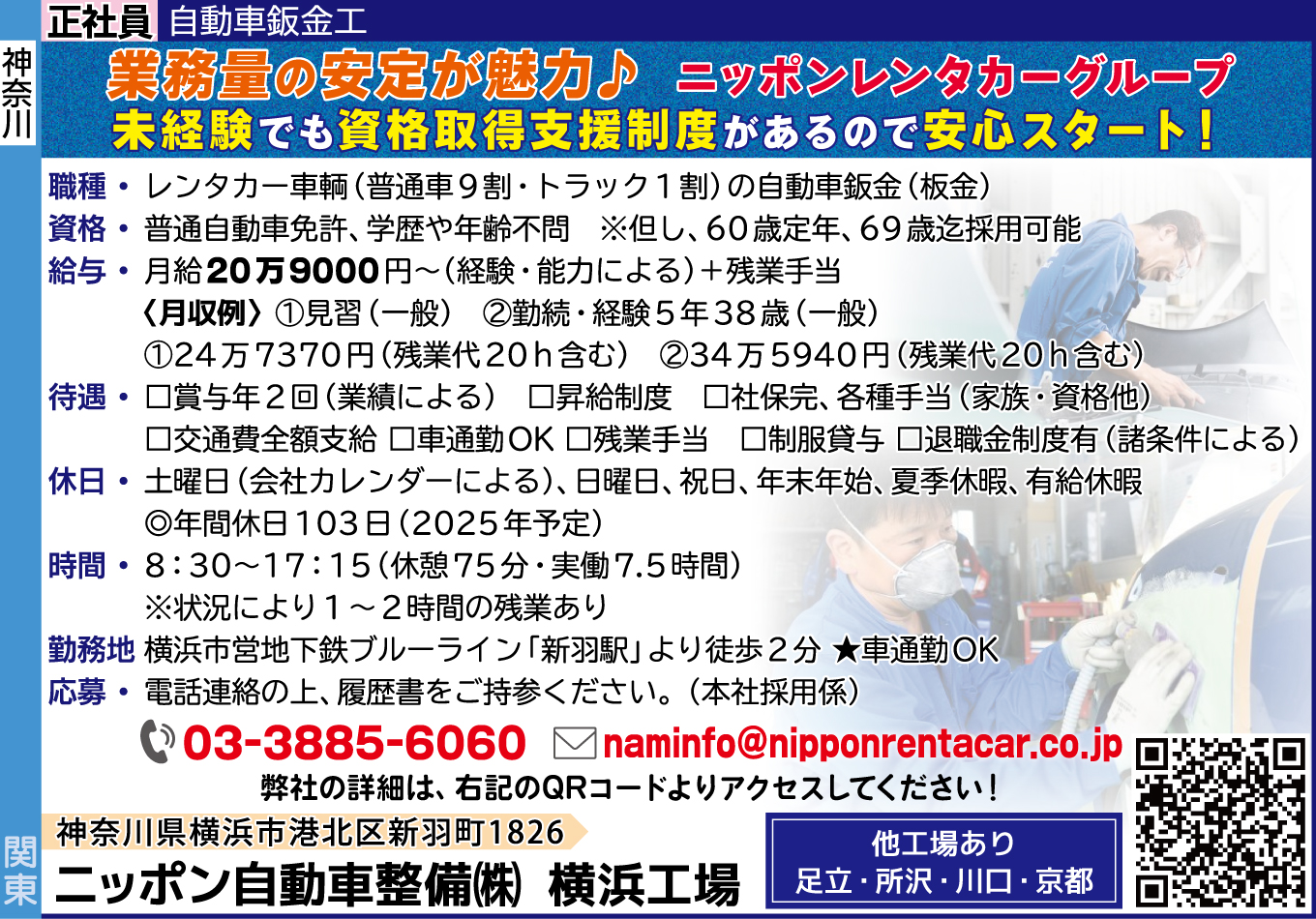 | 仕事内容詳細 | 業務量の安定が魅力♪ニッポンレンタカーグループ 未経験でも資格取得支援制度があるので安心スタート! 職種/ 正社員 自動車鈑金工 レンタカー車輌(普通車9割・トラック1割)の自動車鈑金(板金) 資格/ 普通自動車免許、学歴や年齢不問 ※但し、60歳定年、69歳迄採用可能 給与/ 月給20万9000円〜(経験・能力による)+残業手当 〈月収例〉 ①見習(一般) 24万7370円(残業代20h含む) ②勤続・経験5年38歳(一般) 34万5940円(残業代20h含む) 待遇/ □賞与年2回(業績による) □昇給制度 □社保完、各種手当(家族・資格他) □交通費全額支給 □車通勤OK □残業手当 □制服貸与 □退職金制度有(諸条件による) 休日/ 土曜日(会社カレンダーによる)、日曜日、祝日 年末年始、夏季休暇、有給休暇 ◎年間休日103日(2025年予定) 時間/ 8:30〜17:15(休憩75分・実働7.5時間) ※状況により1〜2時間の残業あり 勤務地/ 横浜市営地下鉄ブルーライン「新羽駅」より徒歩2分 ★車通勤OK |
