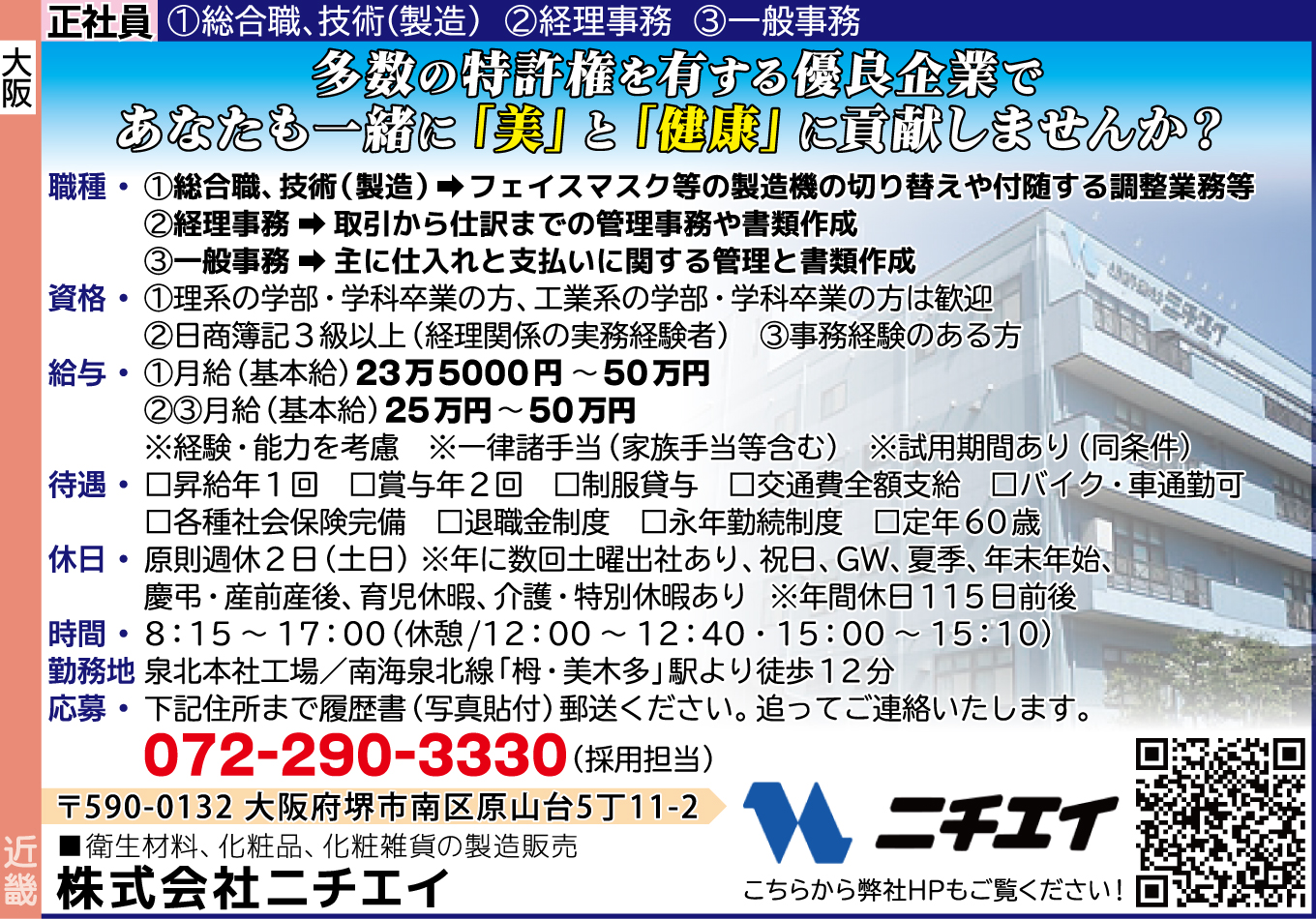 | 仕事内容詳細 | 多数の特許権を有する優良企業で あなたも一緒に「美」と「健康」に貢献しませんか? 職種/ 正社員 ①総合職、技術(製造) フェイスマスク等の製造機の切り替えや付随する調整業務等 ②経理事務 取引から仕訳までの管理事務や書類作成 ③一般事務 主に仕入れと支払いに関する管理と書類作成 資格/ ①理系の学部・学科卒業の方、工業系の学部・学科卒業の方は歓迎 ②日商簿記3級以上(経理関係の実務経験者) ③事務経験のある方 給与/ ①月給(基本給)23万5000円~50万円 ②③月給(基本給)25万円~50万円 ※経験・能力を考慮 ※一律諸手当(家族手当等含む) ※試用期間あり(同条件) 待遇/ □昇給年1回 □賞与年2回 □制服貸与 □交通費全額支給 □バイク・車通勤可 □各種社会保険完備 □退職金制度 □永年勤続制度 □定年60歳 休日/ 原則週休2日(土日) ※年に数回土曜出社あり 祝日、GW、夏季、年末年始、慶弔・産前産後、育児休暇、介護・特別休暇あり ※年間休日115日前後 時間/ 8:15~17:00 休憩/12:00~12:40・15:00~15:10 勤務地/ 泉北本社工場/南海泉北線「栂・美木多」駅より徒歩12分 |