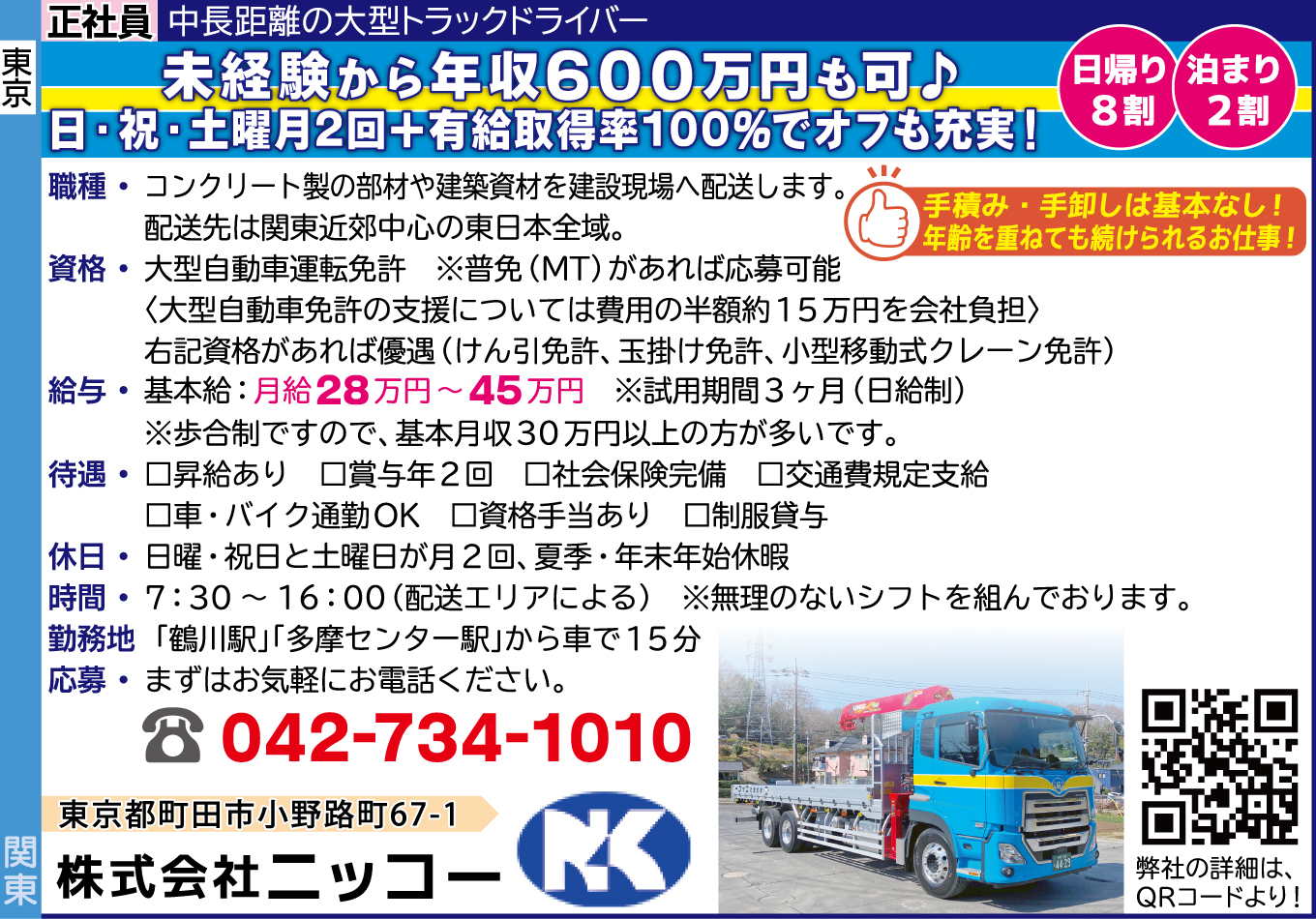 | 仕事内容詳細 | 未経験から年収600万円も可♪ 日・祝・土曜月2回+有給取得率100%でオフも充実! 職種/ 正社員 中長距離の大型トラックドライバーコンクリート製の部材や建築資材を建設現場へ配送します。配送先は関東近郊中心の東日本全域。 ★日帰り:8割 ★泊まり:2割(1~2泊) ✓手積み・手卸しは基本なし! ✓年齢を重ねても続けられるお仕事! 資格/ 大型自動車運転免許 ※普免(MT)があれば応募可能 大型自動車免許の支援については費用の半額約15万円を会社負担 右記資格があれば優遇(けん引免許、玉掛け免許、小型移動式クレーン免許) 給与/ 基本給:月給28万円~45万円 ※試用期間3ヶ月(日給制) ※歩合制ですので、基本月収30万円以上の方が多いです。 待遇/ □昇給あり □賞与年2回 □社会保険完備 □交通費規定支給 □車・バイク通勤OK □資格手当あり □制服貸与 休日/ 日曜・祝日と土曜日が月2回 夏季・年末年始休暇 時間/ 7:30~16:00(配送エリアによる) ※無理のないシフトを組んでおります。 勤務地/ 「鶴川駅」「多摩センター駅」から車で15分 |