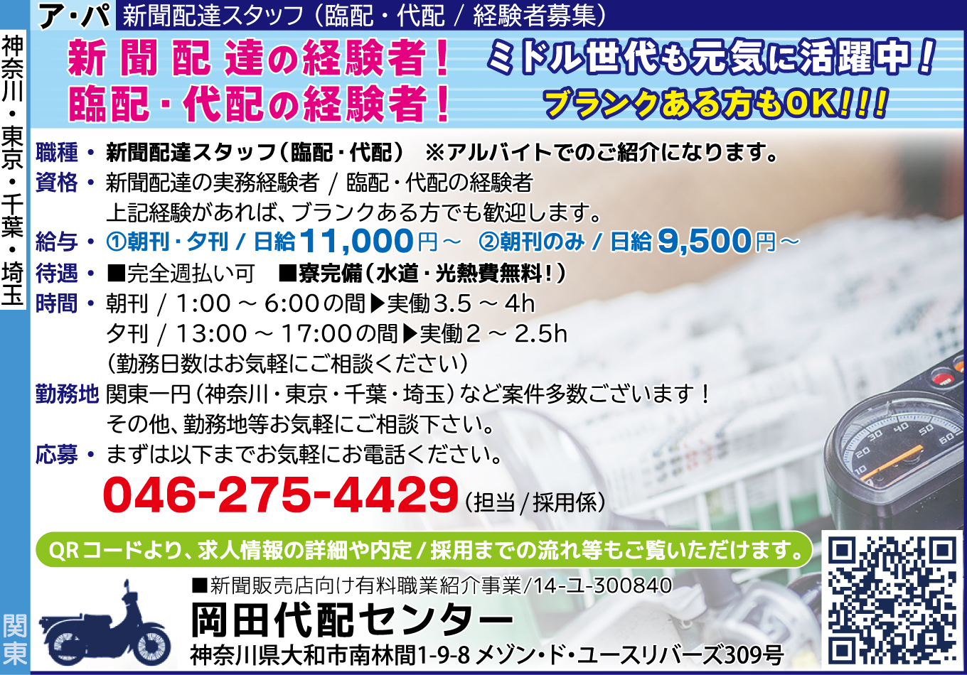 | 仕事内容詳細 | 新聞配達の経験者❗ 臨配・代配の経験者❗ ミドル世代も元気に活躍中❗ ブランクある方もOK❗ 職種/ 新聞配達スタッフ(臨配・代配) ※アルバイトでのご紹介になります 資格/ 新聞配達の実務経験者 臨配・代配の経験者 上記経験があれば、ブランクある方でも歓迎します。 給与/ ①朝刊・夕刊 / 日給1万1000円~ ②朝刊のみ / 日給9500円~ 待遇/ □完全週払い可 □寮完備(水道・光熱費無料!) 時間/ 朝刊 / 1:00~6:00の間▶実働3.5~4h 夕刊 / 13:00~17:00の間▶実働2~2.5h (勤務日数はお気軽にご相談ください) 勤務地/ 関東一円(神奈川・東京・千葉・埼玉)など案件多数ございます! その他、勤務地等お気軽にご相談下さい。 |