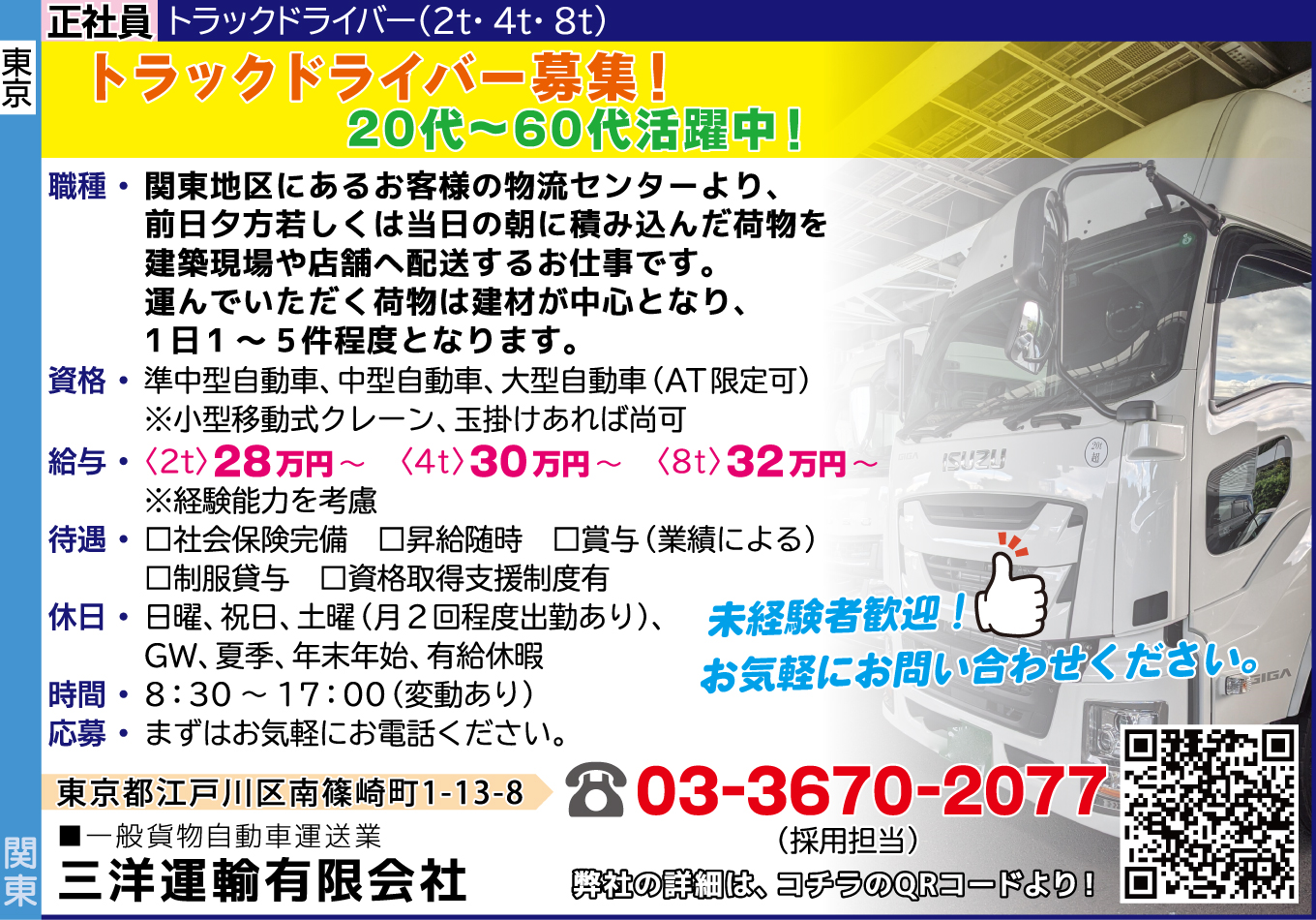 | 応募方法 | まずはお気軽にお電話ください。 03-3670-2077 採用担当 未経験者歓迎!お気軽にお問い合わせください。 ■一般貨物自動車運送業 弊社の詳細は、下記URLより! |