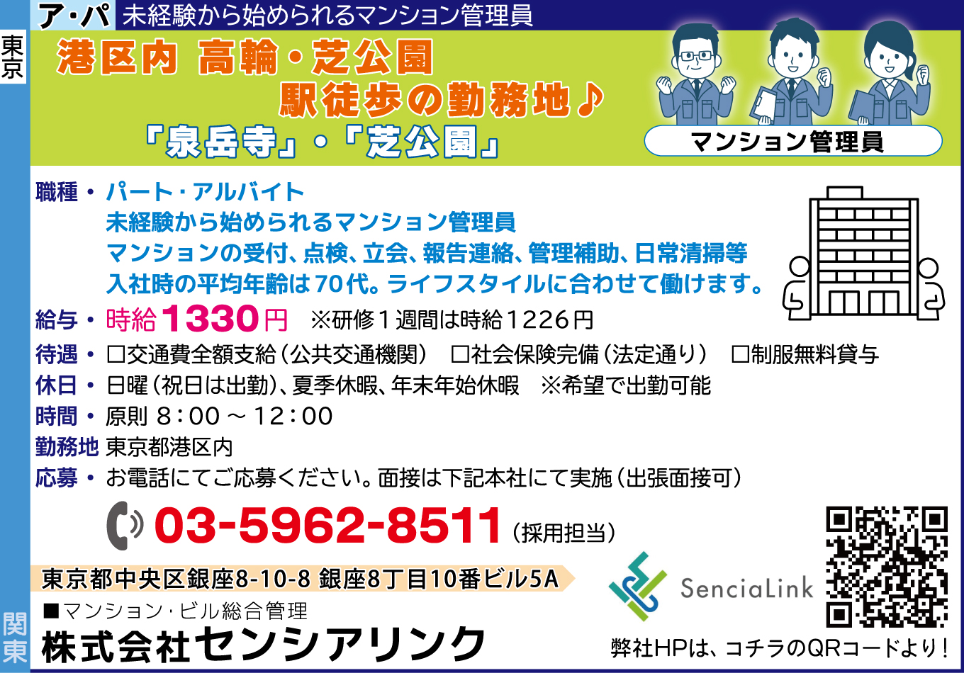 | 仕事内容詳細 | 港区内 高輪・芝公園 駅徒歩の勤務地! 「泉岳寺」・「芝公園」 職種/ パート・アルバイト/未経験から始められるマンション管理員 マンションの受付、点検、立会、報告連絡、管理補助、日常清掃等 入社時の平均年齢は70代。ライフスタイルに合わせて働けます。 給与/ 時給1330円 ※研修1週間は時給1226円 待遇/ □交通費全額支給(公共交通機関) □社会保険完備(法定通り) □制服無料貸与 休日/ 日曜(祝日は出勤)、夏季休暇、年末年始休暇 ※希望で出勤可能 時間/ 原則 8:00~12:00 勤務地/ 東京都港区内 |