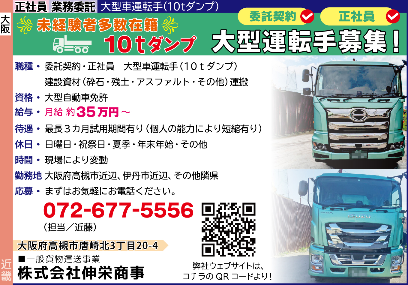 | 仕事内容詳細 | 大型(10tダンプ)運転手募集! 未経験者多数在籍 職種/ 委託契約・正社員 大型車運転手(10tダンプ) 建設資材(砕石・残土・アスファルト・その他)運搬 資格/ 大型自動車免許 給与/ 月給 約35万円~ 待遇/ 最長3カ月試用期間有り(個人の能力により短縮有り) 休日/ 日曜日・祝祭日・夏季・年末年始・その他 時間/ 現場により変動 勤務地/ 大阪府高槻市近辺、伊丹市近辺、その他隣県 |