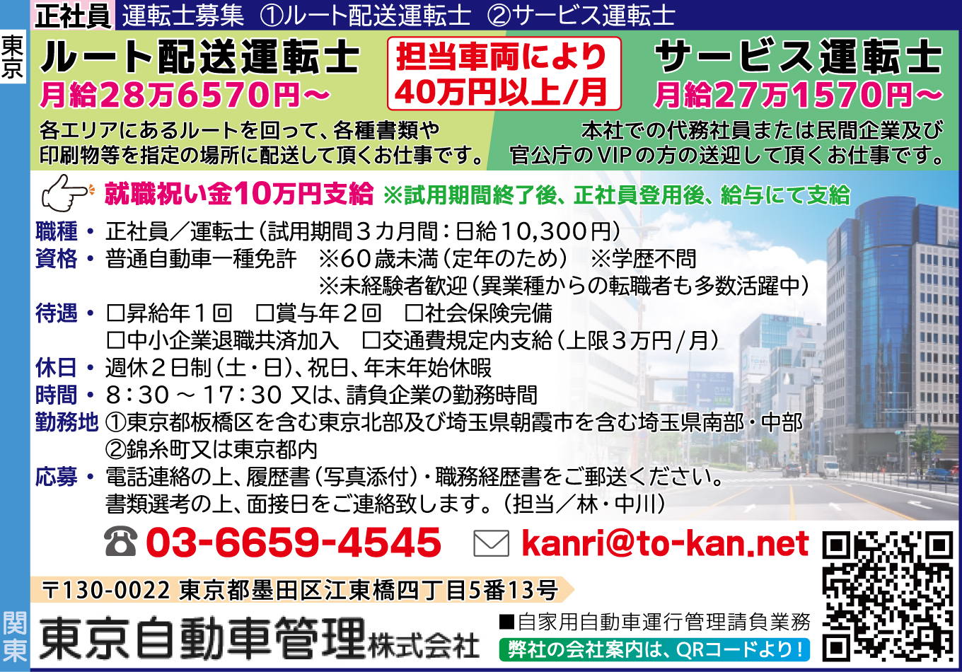 | 応募方法 | 電話連絡の上、履歴書(写真添付)・職務経歴書をご郵送ください。 書類選考の上、面接日をご連絡致します。 電 話:03-6659-4545 メール:kanri★to-kan.net 担当/林・中川 ※メールにてご連絡いただく場合、上記メールアドレス中「★」を半角「@」に変更して送信下さい。 ■自家用自動車運行管理請負業務 弊社の会社案内は、下記URLより! |