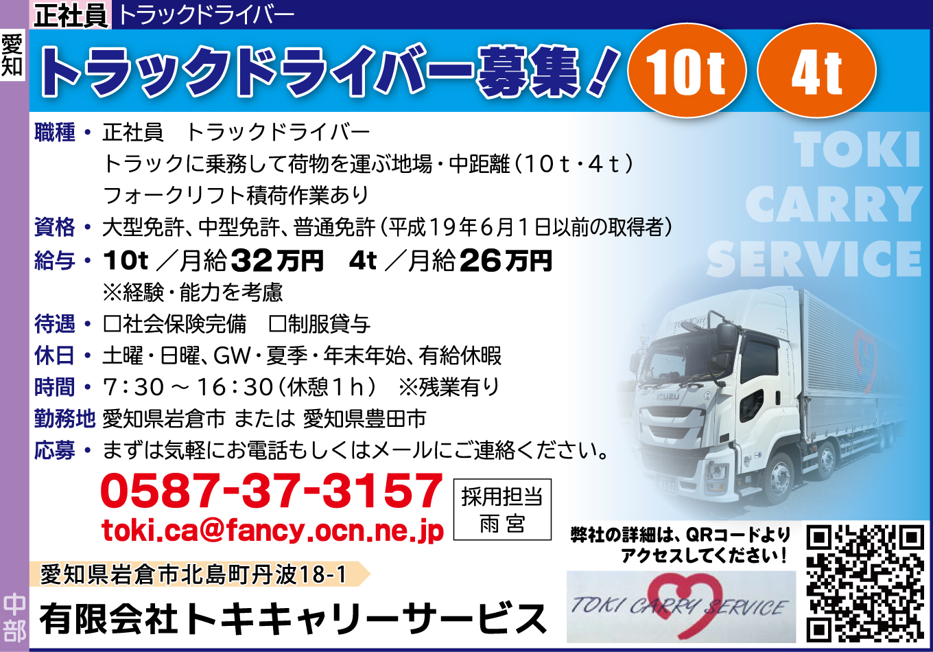 応募方法 | まずは気軽にお電話もしくはメールにご連絡ください。 0587-37-3157 toki.ca★fancy.ocn.ne.jp 採用担当:雨宮 ※メールにてご連絡いただく場合、上記メールアドレス中「★」を半角「@」に変更して送信下さい。 弊社の詳細は、下記URLよりアクセスしてください! |