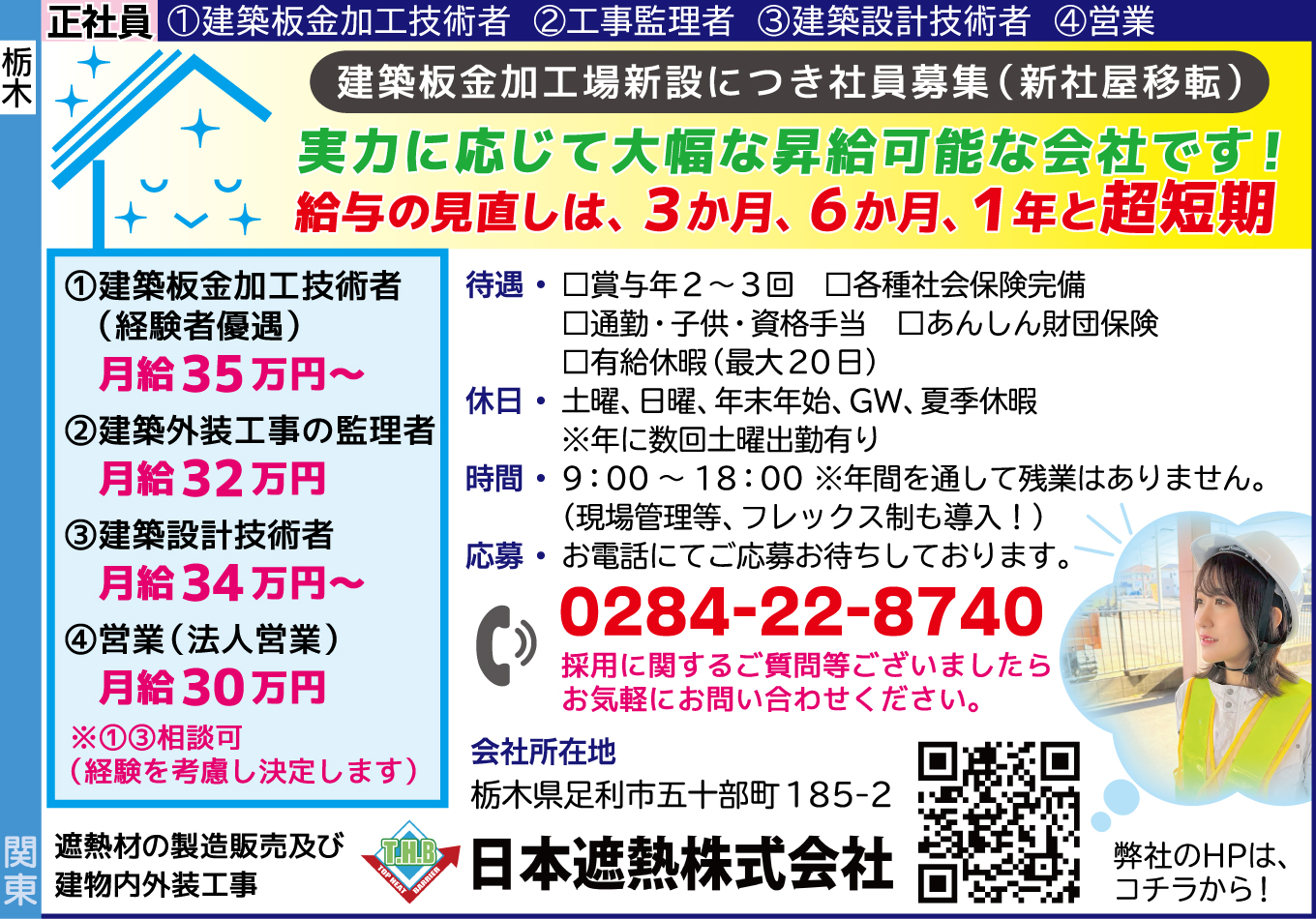| 応募方法 | お電話にてご応募お待ちしております。 採用に関するご質問等ございましたらお気軽にお問い合わせください。 0284-22-8740 ■遮熱材の製造販売及び建物内外装工事 弊社のHPは下記URLから! |
