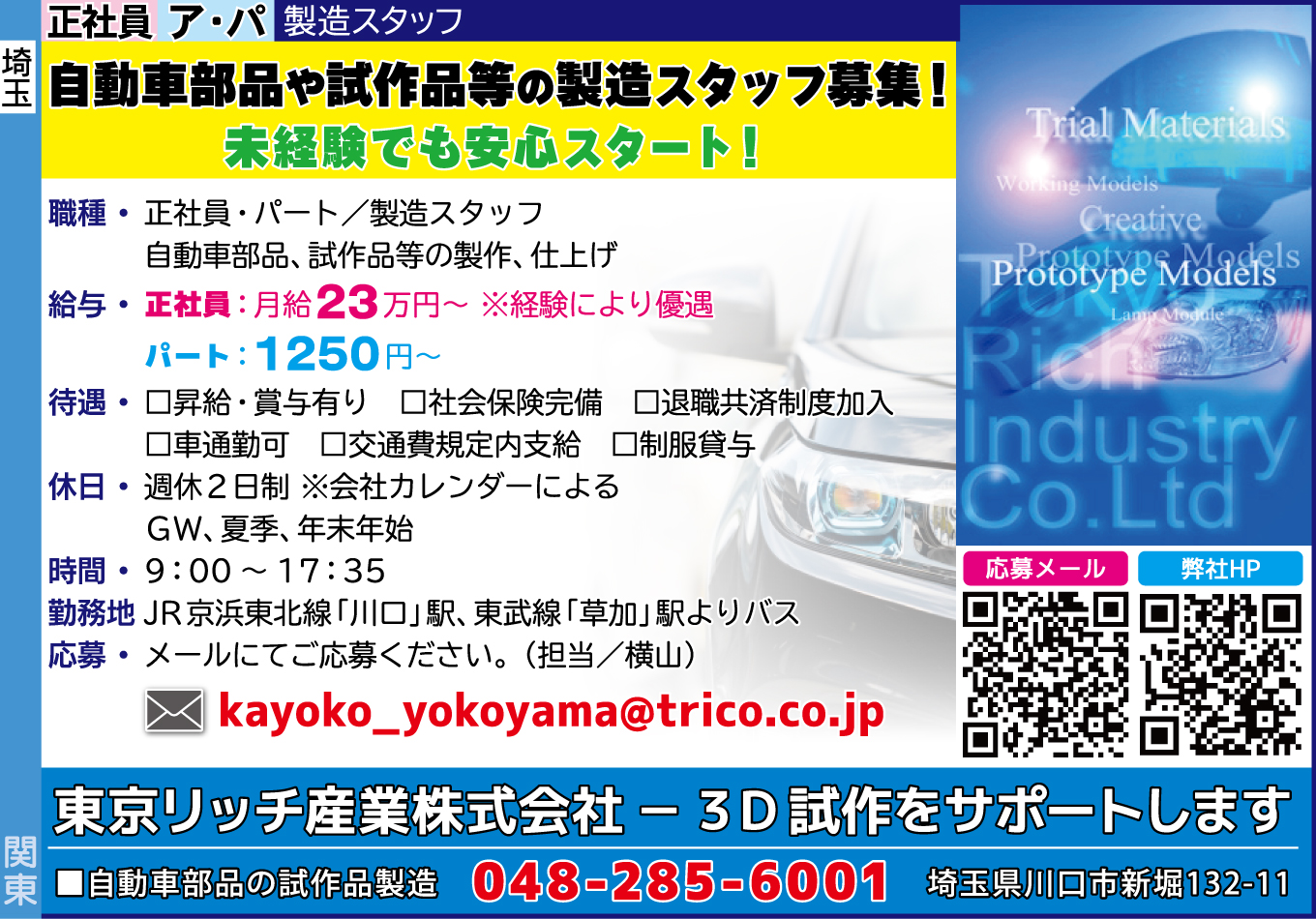 | 応募方法 | メールにてご応募ください。 kayoko_yokoyama★trico.co.jp 担当/横山 ※メールにてご連絡いただく場合、上記メールアドレス中「★」を半角「@」に変更して送信下さい。 ■自動車部品の試作品製造 弊社HPは、下記URLより! |