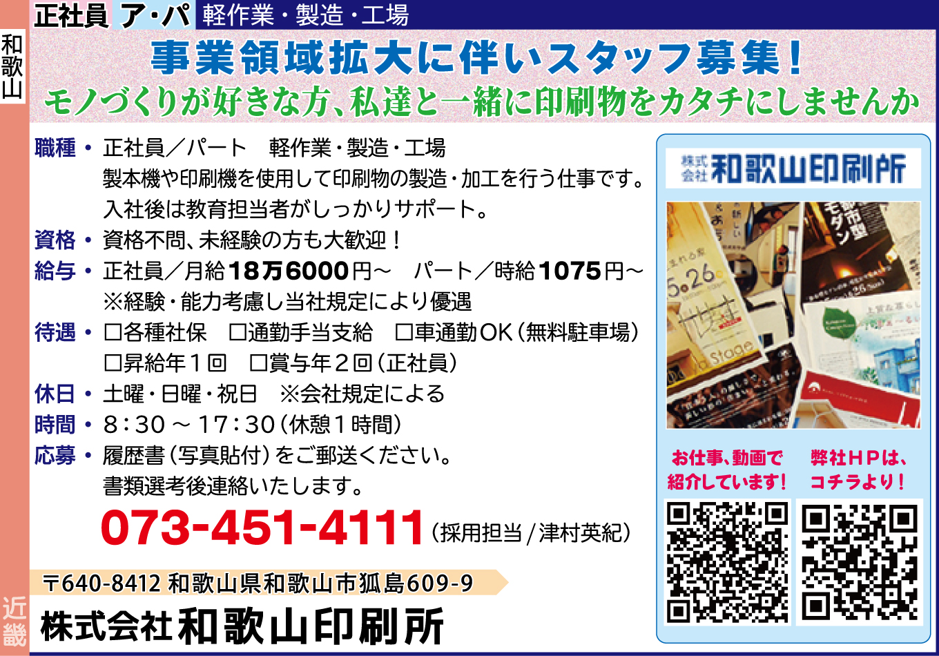 応募方法 | 履歴書(写真貼付)をご郵送ください。 書類選考後連絡いたします。 073-451-4111 〒640-8412 和歌山県和歌山市狐島609-9 採用担当/津村英紀 弊社ウェブサイトは、下記URLよりアクセス! お仕事、動画で紹介しています! |