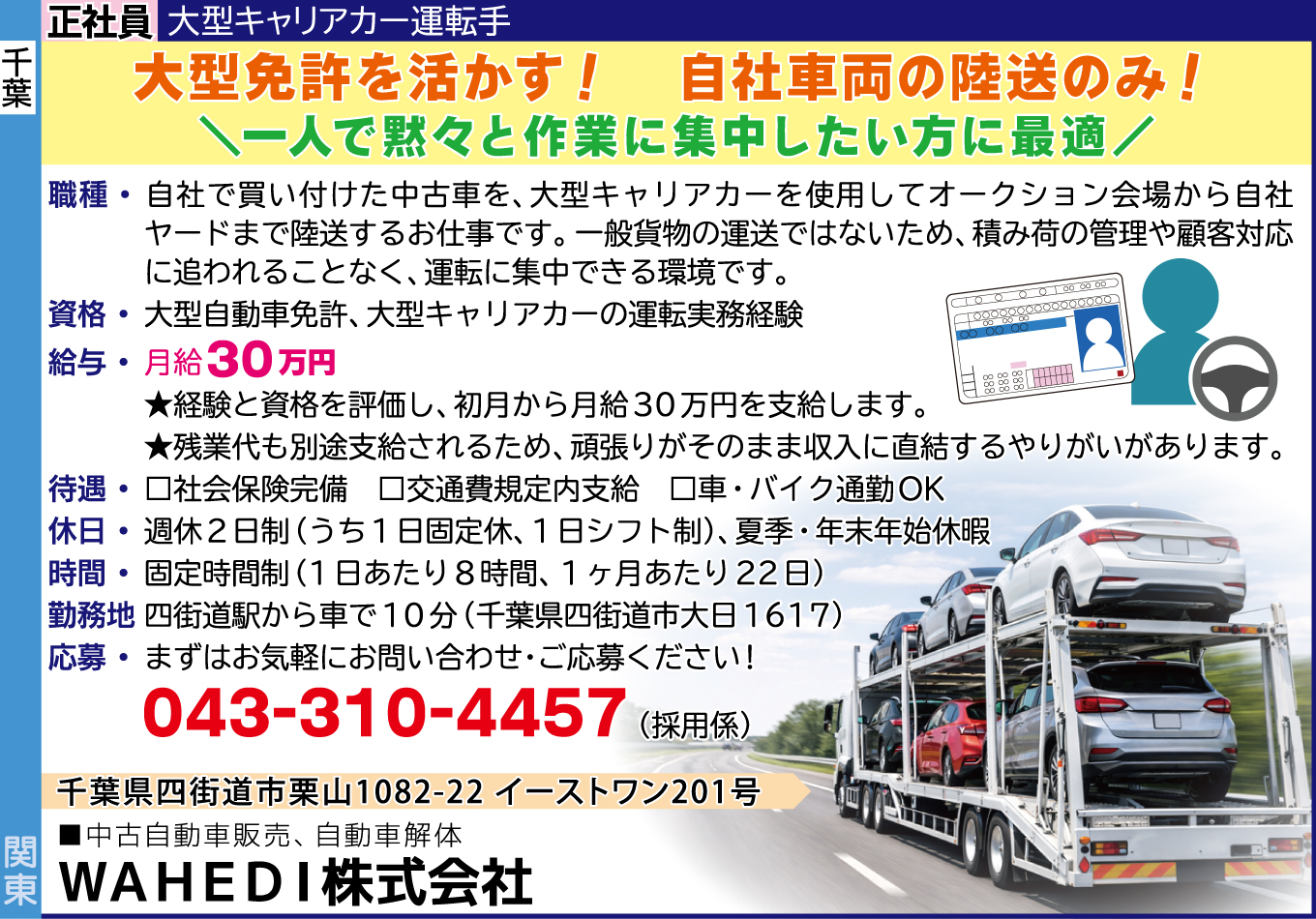 職種/正社員 大型キャリアカー運転手自社で買い付けた中古車を、大型キャリアカーを使用してオークション会場から自社ヤードまで陸送するお仕事です。一般貨物の運送ではないため、積み荷の管理や顧客対応に追われることなく、運転に集中できる環境です。
