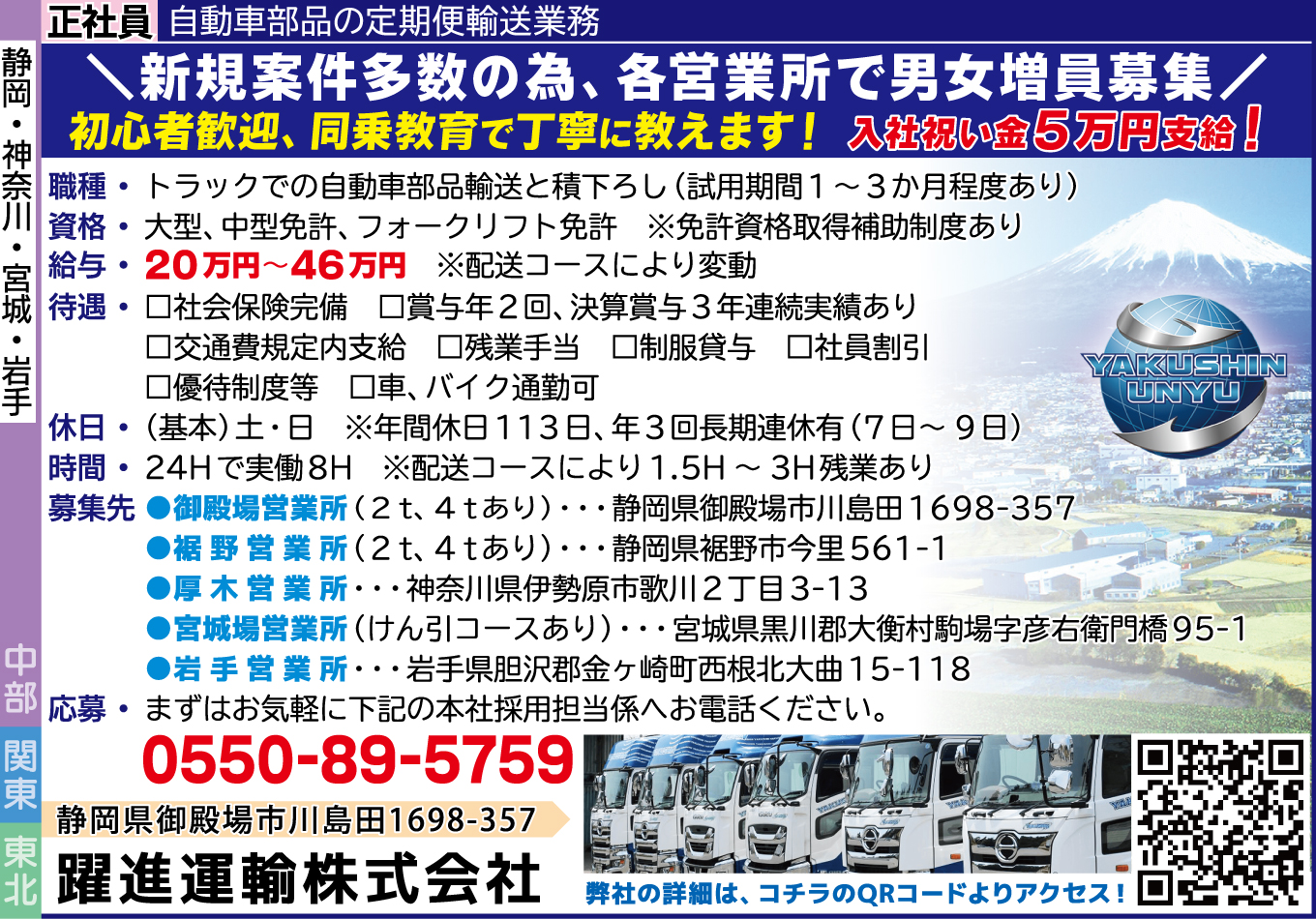 | 仕事内容詳細 | \新規案件多数の為、各営業所で男女増員募集/ 初心者歓迎、同乗教育で丁寧に教えます! 入社祝い金5万円支給! 職種/ 正社員 自動車部品の定期便輸送業務 トラックでの自動車部品輸送と積下ろし ※試用期間1~3か月程度あり 資格/ 大型、中型免許、フォークリフト免許 ※免許資格取得補助制度あり 給与/ 20万円~46万円 ※配送コースにより変動 待遇/ □社会保険完備 □賞与年2回、決算賞与3年連続実績あり □交通費規定内支給 □残業手当 □制服貸与 □社員割引 □優待制度等 □車、バイク通勤可 休日/ (基本)土・日 ※年間休日113日、年3回長期連休有(7日~9日) 時間/ 24Hで実働8H ※配送コースにより1.5H~3H残業あり 募集先/ ●御殿場営業所(2t、4tあり)/静岡県御殿場市川島田1698-357 ●裾野営業所(2t、4tあり)/静岡県裾野市今里561-1 ●厚木営業所/神奈川県伊勢原市歌川2丁目3-13 ●宮城場営業所(けん引コースあり)/宮城県黒川郡大衡村駒場字彦右衛門橋95-1 ●岩手営業所/岩手県胆沢郡金ヶ崎町西根北大曲15-118 |