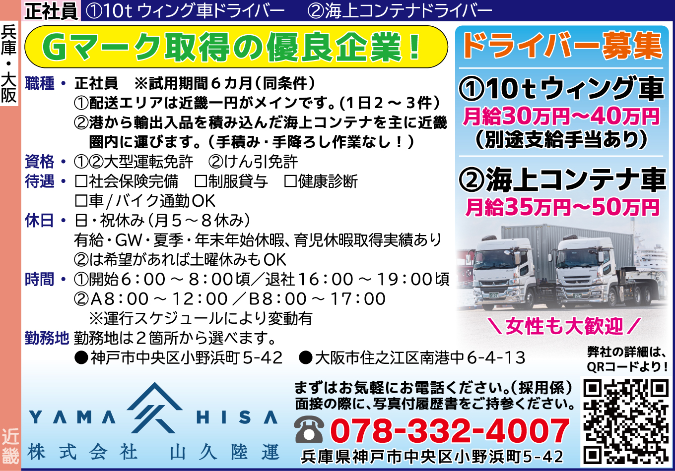| 仕事内容詳細 | Gマーク取得の優良企業! ドライバー募集! \女性も大歓迎/ 職種/ 正社員 ※試用期間6カ月(同条件) ①10tウィング車ドライバー ★配送エリアは近畿一円がメインです。(1日2~3件) ②海上コンテナドライバー ★港から輸出入品を積み込んだ海上コンテナを主に近畿圏内に運びます。(手積み・手降ろし作業なし!) 資格/ ①②大型運転免許 ②けん引免許 給与/ ①月給30万円~40万円(別途支給手当あり) ②月給35万円~50万円 待遇/ □社会保険完備 □制服貸与 □健康診断 □車/バイク通勤OK 休日/ 日・祝休み(月5~8休み) 有給・GW・夏季・年末年始休暇、育児休暇取得実績あり ②は希望があれば土曜休みもOK 時間/ ①開始6:00~8:00頃/退社16:00~19:00頃 ②A8:00~12:00/B8:00~17:00 ※運行スケジュールにより変動有 勤務地/ 勤務地は2箇所から選べます。 ●神戸市中央区小野浜町5-42 ●大阪市住之江区南港中6-4-13 |