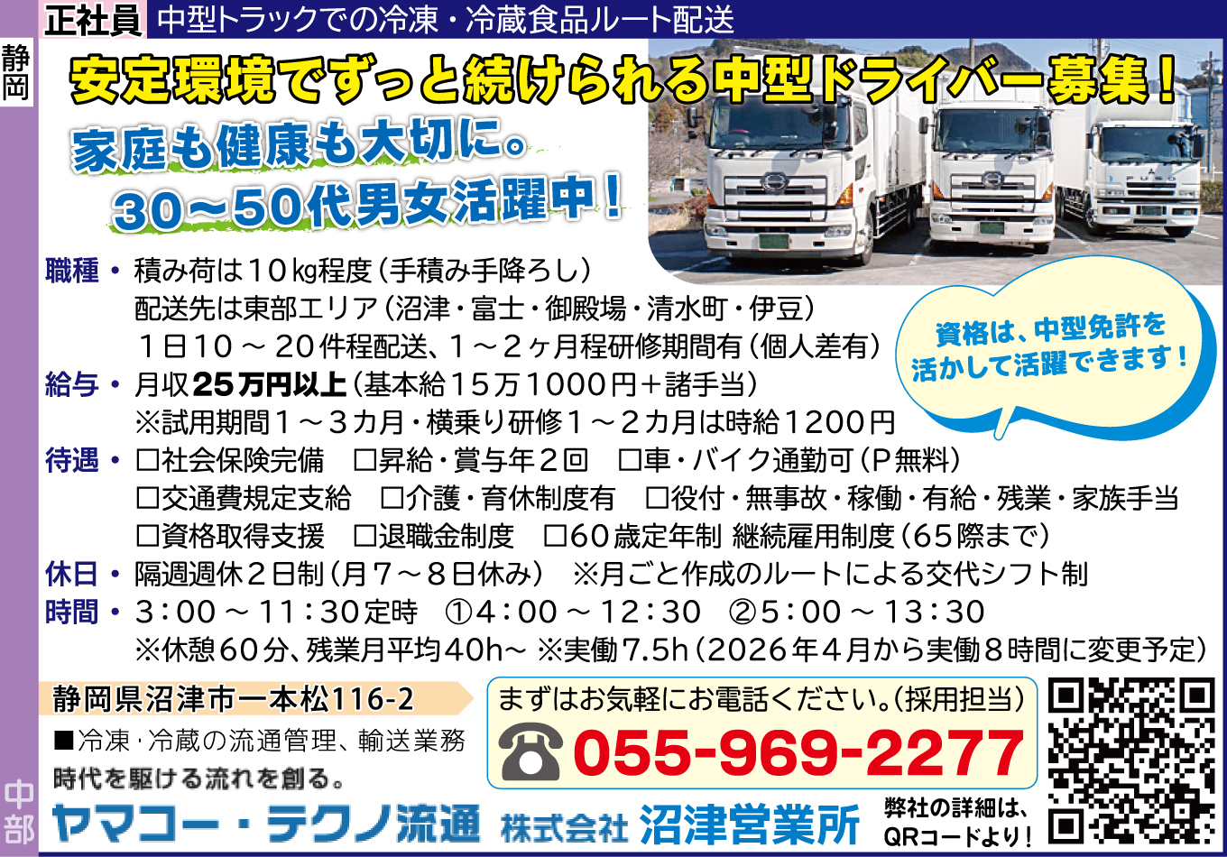 | 仕事内容詳細 | 安定環境でずっと続けられる中型ドライバー募集! 家庭も健康も大切に。 30~50代男女活躍中! 資格は、中型免許(AT限定可)を活かして活躍できます! 職種/ 正社員 中型トラックでの冷凍・冷蔵食品ルート配送(静岡県内) 積み荷は10㎏程度(手積み手降ろし) 配送先は東部エリア(沼津・富士・御殿場・清水町・伊豆) 1日10~20件程配送 1~2ヶ月程研修期間有(個人差有) 資格/ 要中型免許 給与/ 月収25万円以上(基本給15万1000円+諸手当) ※試用期間1~3カ月・横乗り研修1~2カ月は時給1200円 待遇/ □社会保険完備 □昇給・賞与年2回 □車・バイク通勤可(P無料) □交通費規定支給 □介護・育休制度有 □役付・無事故・稼働・有給・残業・家族手当 □資格取得支援 □退職金制度 □60歳定年制 継続雇用制度(65際まで) 休日/ 隔週週休2日制(月7~8日休み) ※月ごと作成のルートによる交代シフト制 時間/ 3:00~11:30定時 ①4:00~12:30 ②5:00~13:30 ※休憩60分、残業月平均40h~ ※実働7.5h(2026年4月から実働8時間に変更予定) |