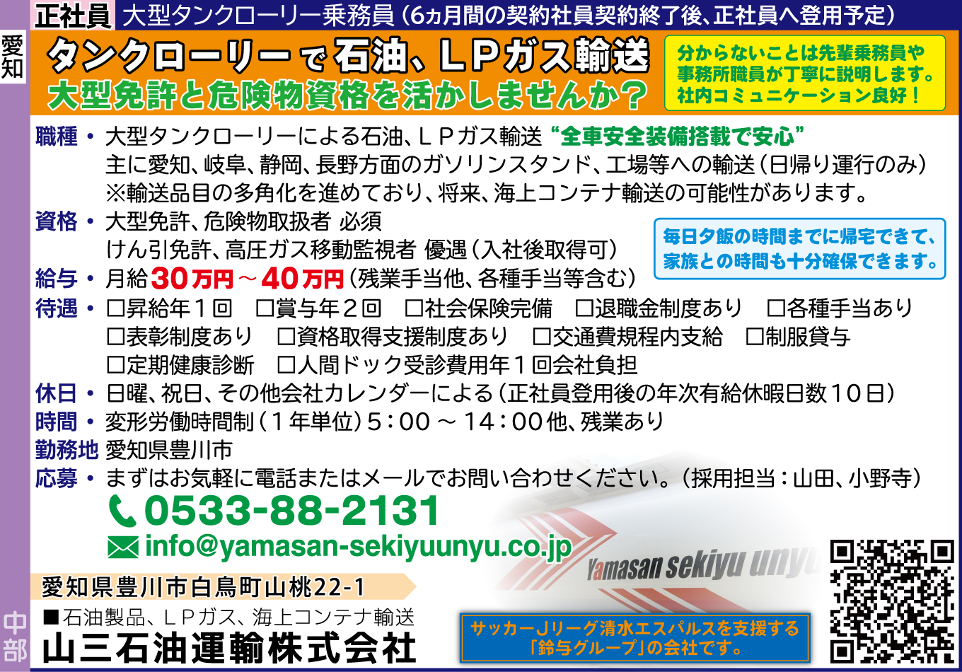 仕事内容詳細 | タンクローリーで石油、LPガス輸送 大型免許と危険物資格を活かしませんか? 分からないことは先輩乗務員や事務所職員が丁寧に説明します。 社内コミュニケーション良好! 毎日夕飯の時間までに帰宅できて、家族との時間も十分確保できます。 職種/ 正社員 大型タンクローリー乗務員 “全車安全装備搭載で安心” ※6ヵ月間の契約社員契約終了後、正社員へ登用予定 大型タンクローリーによる石油、LPガス輸送 主に愛知、岐阜、静岡、長野方面のガソリンスタンド、工場等への輸送(日帰り運行のみ) ※輸送品目の多角化を進めており、将来、海上コンテナ輸送の可能性があります。 資格/ 大型免許、危険物取扱者 必須 けん引免許、高圧ガス移動監視者 優遇(入社後取得可) 給与/ 月給30万円~40万円(残業手当他、各種手当等含む) 待遇/ □昇給年1回 □賞与年2回 □社会保険完備 □退職金制度あり □各種手当あり □表彰制度あり □資格取得支援制度あり □交通費規程内支給 □制服貸与 □定期健康診断 □人間ドック受診費用年1回会社負担 休日/ 日曜、祝日、その他会社カレンダーによる(正社員登用後の年次有給休暇日数10日) 時間/ 変形労働時間制(1年単位)5:00~14:00他、残業あり 勤務地/ 愛知県豊川市 ☆サッカーJリーグ 清水エスパルスを支援する「鈴与グループ」の会社です。 |